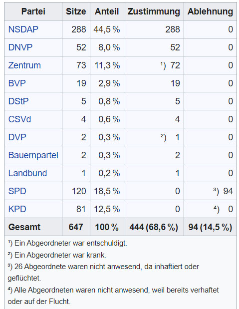 Das Ergebnis der Abstimmung in Zahlen: Ja-Stimmen: NSDAP(288), DNVP (52), Zentrum(72), BVP(19), DStP(5), CSVd(4), DVP(1), Bauernpartei(2), Landbund(1). Die SPD stimmte geschlossen mit Nein: 94 Stimmen. 68,6 vh votierten also mit Ja, 14,5 vh mit Nein.