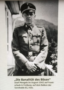Immer erinnern uns Fotos, Infotafeln und bewegende Zeitzeugenberichte an die NS-Geschichte- in einer Zeit, da die Zahl der Zeitzeuginnen und Zeitzeugen schwindet und die Erinnerungen verblassen. Man sieht einen der schlimmsten Figuren der Nazi-Zeit, den berüchtigten KZ-Auschwitz-Arzt Mengele in Freiburg.Gemeldet war er 1943/44 in der Sonnhalde 81 der Stadt, er wohnte bei den Eltern seiner Frau Irene Schöenbein. In Briefen beklagte sich der Massenmörder über die „Öde des Alltags und des KL-Betriebs“. In einer anderen Info lesen wir folgenden Text über die Deportation der Familie Spindler: “ Am 24. März 1943 wurden 16 Mitglieder der Familie Spindler in Herbolzheim von Polizeibeamten als „Zigeuner“ verhaftet. Um 16.41 Uhr fuhr der Zug ab, der sie vor den Augen der Herbolzheimerinnen und Herbolzheimer ins Lager Auschwitz II Birkenau brachte. Nur die beiden Brüder Franz und Lorenz Spindler überlebten.