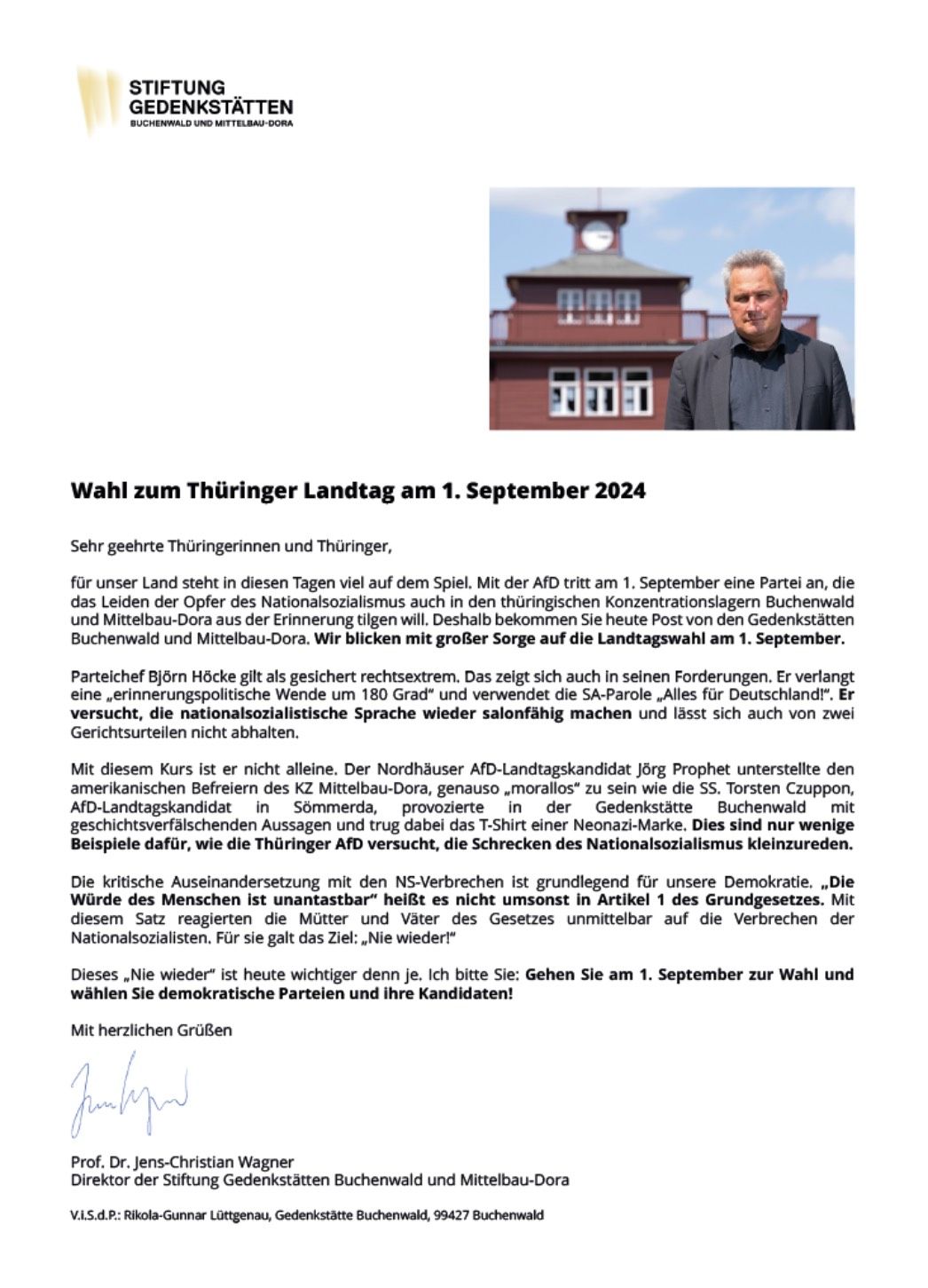 Der Leiter der Gedenkstätte Buchenwald und Mittelbau-Dora, Jens Christian Wagner hat etwas getan, was die AfD nicht leiden kann. Er hat sich mit einem Brief an alle Thüringerinnen und Thüringer über 65 gewandt und über seine Sorgen berichtet, was es für die Erinnerungsarbeit in den Vernichtungslagern der Nazi Zeit bedeutet, sollte die AfD etwas im Land zu sagen haben. Er nennt Beispiele wie Björn Höcke, der eine erinnungspolitische Wende um 180 Grad fordert. Und andere AfD Kandidaten, die respektlos und geschichtsklitternd mit den Gedenkstätten umgehen.