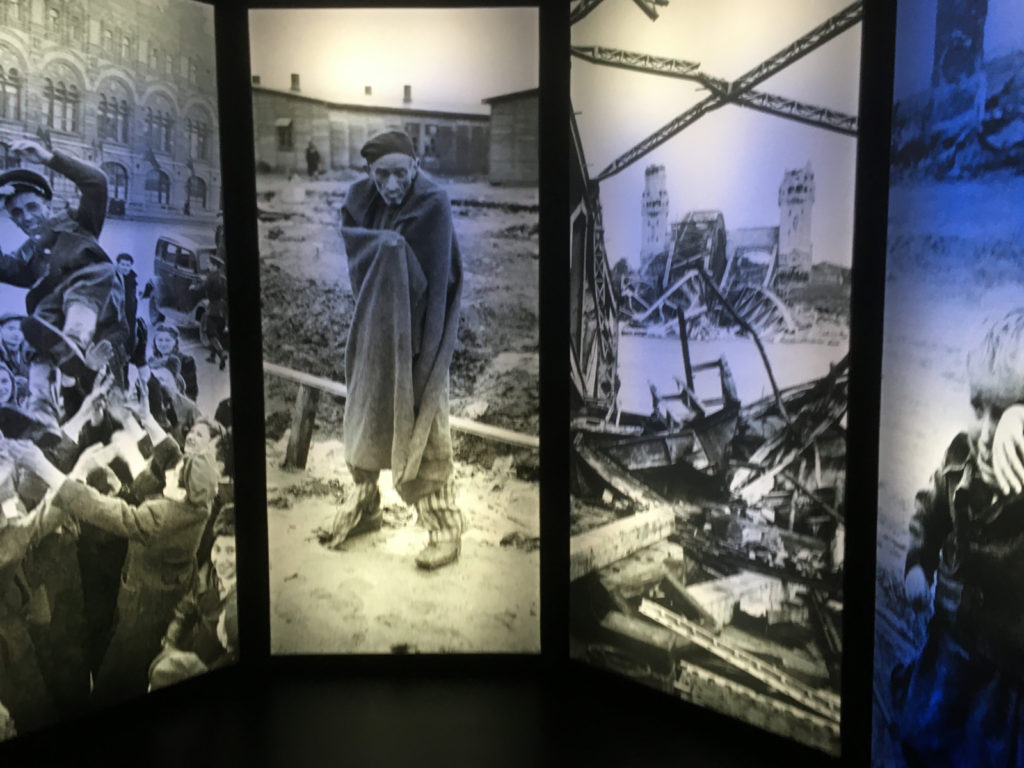 Der Zuschauer stößt zu Beginn auf eine Fotowand mit sechs Einzelbildern, die erschrecken, weil sie widergeben, was zuvor geschehen war. Da blickt man auf einen Mann, abgemagert bis auf die Knochen, in der gestreiften Kleidung, wie man sie in den Konzentrationslagern tragen musste. Da sieht man ein weinendes Kind vor Trümmern. Ja, so sah Berlin damals aus, wie überhaupt deutsche Städte ein Bild aus Trümmern abgaben.