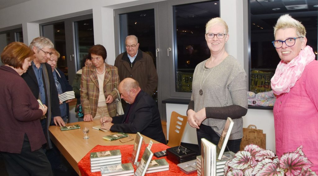 Die Zuhörer standen am Büchertisch der Buchhandlung Schwinning Schlange, um Exemplare des neuen Klaus-Vater-Buchs „Bergstraße“ zu erwerben und signieren zu lassen. Foto: Manfred Lang/pp/Agentur ProfiPress