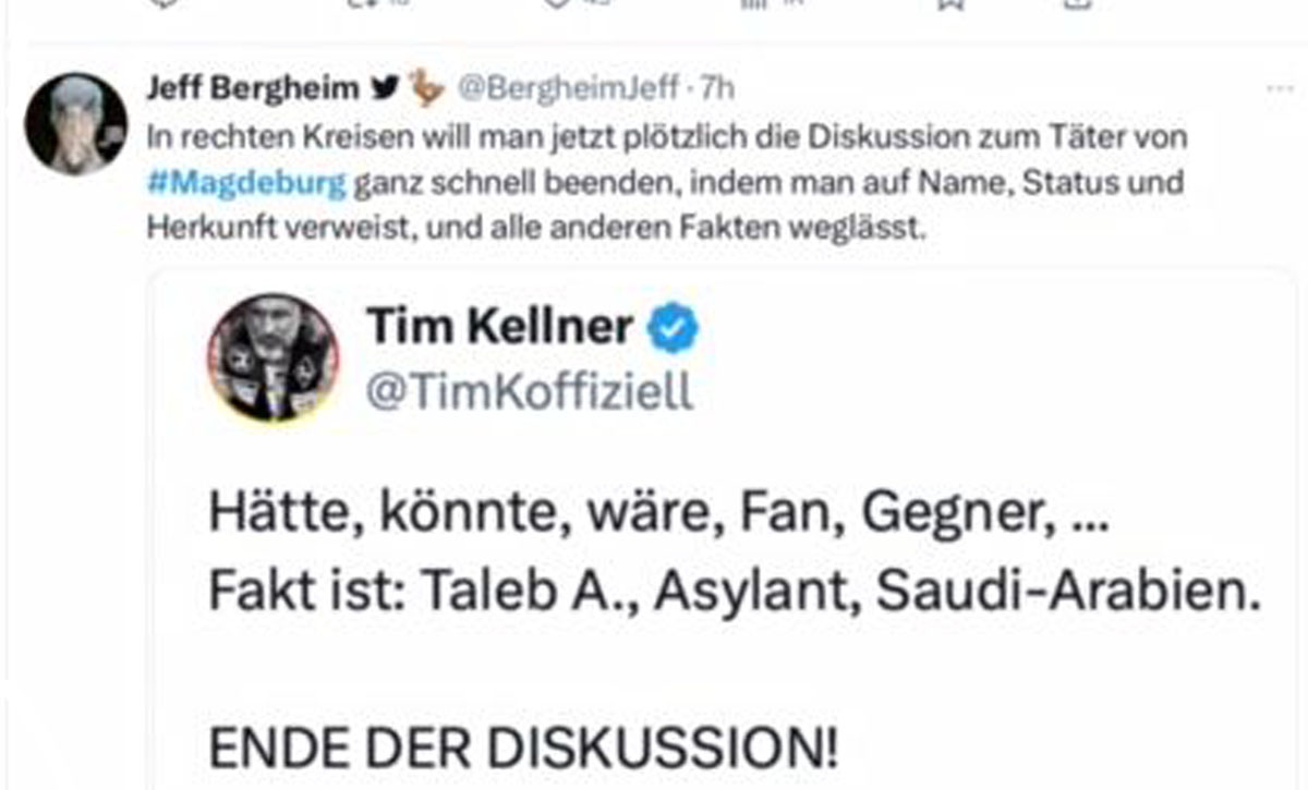 So weit, so schlecht, es ist ja inzwischen bekannt, dass der rechte Mob sich die Welt so dreht, wie es ihnen gerade passt. Natürlich wirft eine solche Tat Fragen auf. Warum sind die Gewalt ankündigenden Postings des Mannes nicht aufgefallen, es soll auch Warnungen aus Saudi Arabien gegeben haben, die dem Psychiater offensichtlich habhaft werden wollten. Aber vieles an der Biografie ist total unauffällig, ein völlig atypisches Täterprofil. Nach aller Trauer um die inzwischen fünf Todesopfer, die Unterstützung für die Verletzten und alle Angehörigen, wird aufarbeiten zu sein, wie das Ganze passieren konnte, ob es Fehler im System gibt, die ein frühzeitiges Erkennen verhindert haben. Das Geschehen in Magdeburg zeigt erneut, Freiheit beinhaltet immer auch ein Restrisiko, dass die Feinde unserer Lebensweise versuchen werden, sie anzugreifen. Gegen Extremisten, egal ob rechtsradikal oder islamistisch muss sich die offene Gesellschaft zur Wehr setzen. Und das mit allen Mitteln.