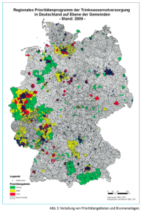 Die Sicherstellung der Trinkwasserversorgung in Notzeiten ist die Aufgabe des Bundesamtes für Bevölkerungsschutz und Katastrophenhilfe, kurz BBK. Unterstützt wird das Amt vor Ort von den Kommunen und dem Technischen Hilfswerk (THW). Die rechtliche Grundlage ist das Wassersicherstellungsgesetz. Dieses regelt die einzelnen Maßnahmen und die Zuständigkeiten. Aufgabe der Trinkwasser-Notversorgung ist die Bereitstellung von Trinkwasser für die, von einer Katastrophe betroffene, Bevölkerung. Bisher hat der Bund mehr als 5.200 Trinkwassernotbrunnen und -quellen geschaffen (siehe Abbildung). Dabei handelt es sich um leitungsnetzunabhängige Anlagen, die sich überwiegend in Wohngebieten von Großstädten und Ballungsräumen befinden. Zur Versorgung von weniger dicht besiedelten Gebieten stehen zusätzlich Trinkwasserbehälter und Leitungen für den mobilen Einsatz zur Verfügung. Eine Planung von Anlagen zur Trinkwasser-Notversorgung erfolgt nur für Ballungsgebiete, welche in den regionalen Prioritätenprogrammen der Bundesländer ausgewiesen sind, klärt die Broschüre „Trinkwassernotbrunnen – Wasserversorgung in Extremsituationen“ des BBK auf (siehe unten).
