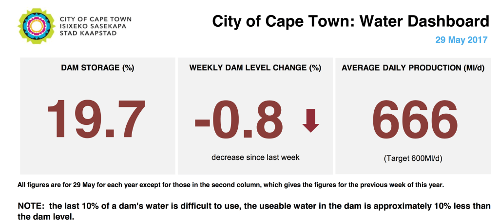 Wasser Vorratsstatistik der Stadt Kapstadt City of Cape Town Waterdashboard 29.5.2017