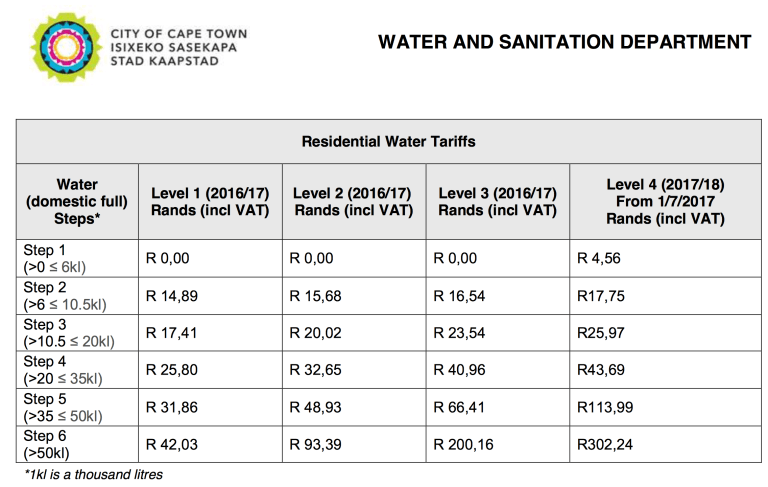 Kapstadt hat ein Wassertarifsystem, das von den Wasservorräten abhängt, d.h. je geringer der Wasserstand in den Stauseen, desto höher die Preise. Jetzt ist das geringste Niveau erreicht. Mit dem Level 4 werden die Wasserpreise zum 1.7.2017 deutlich erhöht (s. Abbildung). Bisher waren die ersten 6.000 Liter kostenlos, ab Juli müssen umgerechnet 0,30 Euro je 1.000 Liter bezahlt werden; wobei sozial schwache Haushalte von der Zahlungspflicht ausgenommen bleiben.