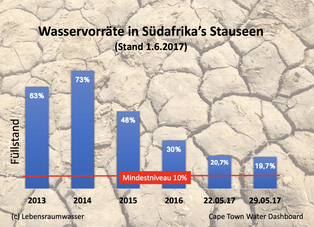 „Der Wasservorrat in den Stauseen liegt bei 19,7%. Seit einer Woche ist er um 1% gesunken. Da die letzten 10% eigentlich nicht brauchbar sind, weil sich darin Ablagerungen befinden, beträgt der Vorrat effektiv nur noch 9,7%,“ muss die Regierung jetzt einräumen. Im März 2017 betrug der Füllgrad der sechs großen Dämme noch 32 %. Die Regenzuflüsse können mit dem steigenden Wasserbedarf nicht Schritt halten, berichtete der Südafrika-Wasserexperte Jochen Nos im März in einem Gastbeitrag für Lebensraumwasser. Die neuen Zahlen belegen, wie dramatisch die Entwicklung mittlerweile ist.