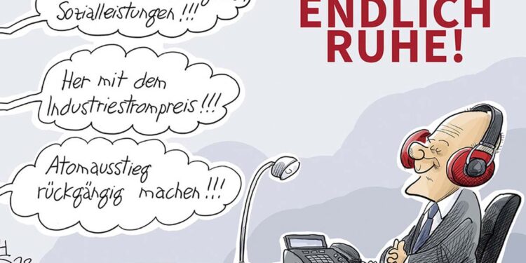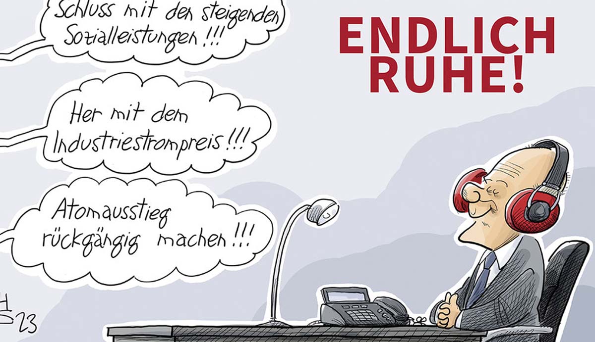 „Endlich Ruhe“! Lautet der Titel des Buches von Heiko Sakurai „Cartoons des Jahres 2023“. Aber natürlich wird Bundeskanzler Olaf Scholz, der Mann mit der Knollennase, der die Aufschlagseite des Buches ziert, diese Ruhe nicht finden. Er mag sie sich wünschen in den Tagen zwischen den Jahren, vor allem angesichts des Dauer-Theaters übers Jahr um seine Ampel-Koalition. Aber weder ist die Politik ein Wunschkonzert, noch liefert der Karikaturist ein solches. Wie immer steht der Kanzler selber im Mittelpunkt der Ereignisse, nahezu alles dreht sich um ihn. Wie eigentlich in jedem Jahr. Sakurai zeichnet Olaf Scholz am Schreibtisch, die Kopfhörer auf, vor sich das Telefon, leicht, fast verschmitzt lächelnd. Folgt man dem Karikaturisten, wirkt Scholz trotz allem wohlauf. Da mögen die Christdemokraten und Arbeitgeber noch so laut „Schluss mit den steigenden Sozialleistungen“ rufen und „Her mit dem Industriestrompreis“ fordern und den „Atomausstieg rückgängig machen!!!“ verlangen. Scholz bleibt gelassen und fröhlich, in sich ruhend. Alles wird gut.