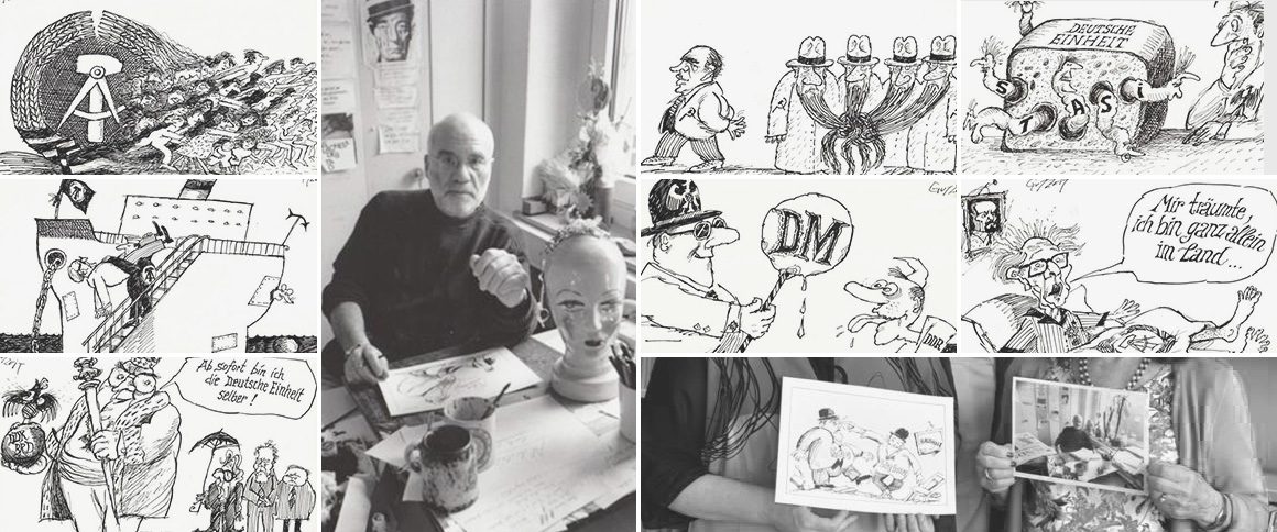 Um an dieser Stelle Bernd Gutzeits Arbeit zu dokumentieren, bieten sich Karikaturen aus der Zeit von Wende und Wiedervereinigung an. Dieser Epochenwechsel jährt sich gerade zum dreißigsten Mal. Längst unstreitig ist, dass die politischen Umbrüche in den Staaten Ost- und Mitteleuropas ohne die Reformen des sowjetischen Staats- und Parteichefs Michail Gorbatschow kaum denkbar gewesen wären. Die WR-Karikatur vom 27. April 1989 war unterschrieben mit: „Gorbi war hier“. Es war sicherlich eine geniale Idee, den alten stalinistischen Knackern vom Politbüro die Bärte zu verknoten – gut fünf Monate später sollte Gorbatschow in Ostberlin, wo alles schon zusammenbrach, seinen berühmten Satz sagen: „Wer zu spät kommt, den bestraft das Leben.“