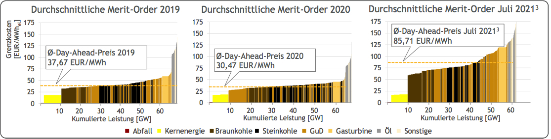 Quantitativ merklich deutlicher waren die Hinweise, die das Energiewirtschaftliche Institut an der Universität zu Köln (EWI) im Juli 2021 gab. Da waren die Großhandelspreise am Strommarkt auf 90 €/MWh bereits gestiegen. Auf der Suche nach den ausschlaggebenden Gründen stieß das EWI auf die Trias gestiegener Kohle-/CO2-Preise einerseits und gestiegener Gaspreise (auf 35 €/MWh) andererseits. Die Analyse wurde zusammengefasst in dieser Abbildung, einer Darstellung der Änderung der Merit-Order-Verhältnisse im Zeitablauf. Aus ihr ist das Volumen der Mehrerlöse am Strommarkt direkt, durch Flächenvergleich, ablesbar: Der durchschnittliche Tagespreis auf Großhandelsstufe hatte sich mit 85,71 €/MWh mehr als verdoppelt. Dass es um viel Geld und eine soziale Problematik