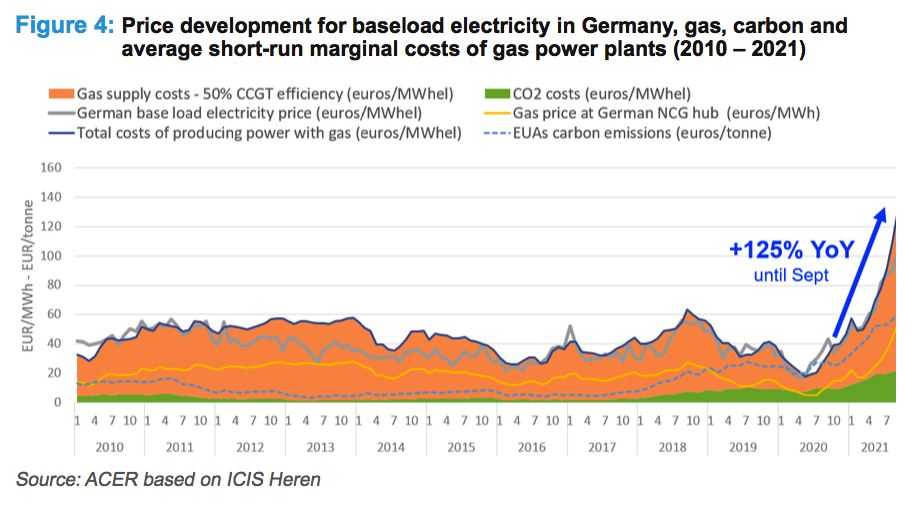 Mit dem Drängen von Mitgliedstaaten, denen sich Deutschland damals nicht angeschlossen hatte, wurde auf EU-Ebene im September 2021 wie folgt umgegangen. Man beauftragte zunächst ACER mit zwei Analysen – ACER ist der Verband der nationalen Behörden in Europa, die mit der Aufsicht über leitungsgebundenen Energieunternehmen betraut sind, also vor allem für Strom und Gas zuständig sind. Mitte Oktober wurde ein Teilergebnis vorgelegt, der diagnostische Teil zu „Higher Energy Prices“. Zentrales Ergebnis war erstens diese Abbildung, die die Dramatik, die damals schon an den Märkten für Gas, CO2-Zertifikate und Elektrizität herrschte, dadurch illustriert, dass der Preisanstieg im Jahre 2021 in den Kontext der Preisentwicklung der Jahre seit 2010 gestellt ist.