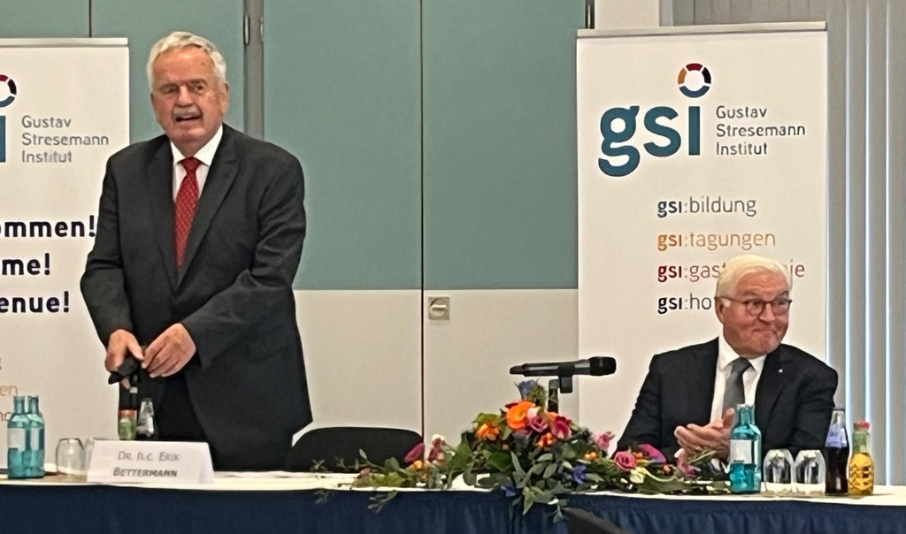 Erik Bettermann weiß natürlich um die Diskussionen, die der Bundespräsident mit seinen Reden für die Demokratie in Deutschland auszuhalten hat, er kennt Frank-Walter Steinmeier seit vielen Jahren, den einstigen engen Mitarbeiter des Ministerpräsidenten und späteren Kanzlers Gerhard Schröder, dann nach der Abwahl des SPD-Kanzlers Außenminister im Kabinett von Angela Merkel,  schließlich Bundespräsident. Seine Rede zum 9. November 1938 hat viel Zuspruch bekommen. Bettermann zitiert den letzten Absatz dieser wirklich eindrucksvollen Rede: „Mein Wunsch an diesem 9. November ist aus tiefstem Herzen: Stehen wir zusammen- für die Selbstbehauptung von Demokratie und Menschlichkeit! Geben wir nicht und niemals preis, was uns ausmacht. Vertrauen wir uns selbst! Tun wir, was getan werden muss!“