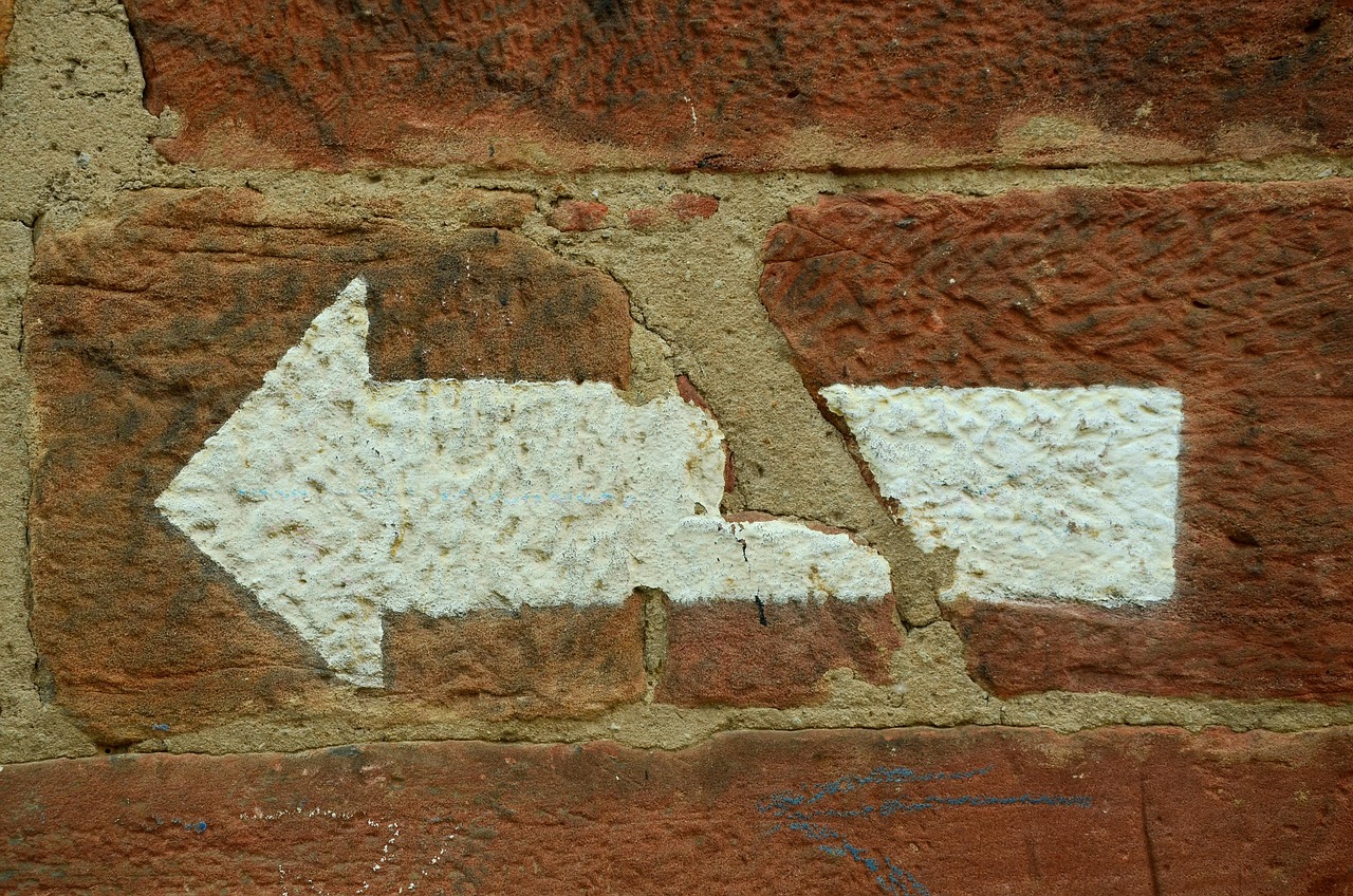Weißer Abbiegepfeil nach links auf roter Ziegelsteinmauer