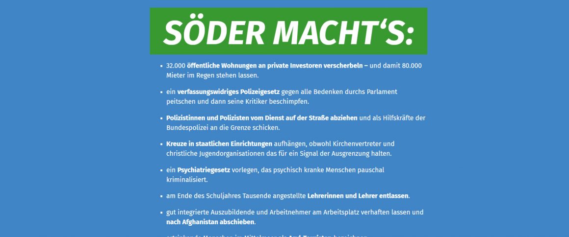 Es trifft sie in ihrem ganzen Stolz, dass ausgerechnet die in Bayern kleine SPD, die bei Umfragen gerade mal so etwas über 12 Prozent erhält, ihr  den Wahlkampf-Slogan geklaut hat. So kann es gehen, wenn man immer nur auf sich schaut, weil die anderen ja eh keine Rolle spielen, wenn es um die Wurst geht. „Söder macht´s,“ so der Slogan  der CSU, nicht schlecht, kurz und knackig, gut zu merken, der Wähler muss sich nicht lange fragen, was das bedeutet, was er da an jeder Ecke liest. Dazu der Regierungschef im Trachtenanzug. Nur haben die CSU-Wahlkämpfer es versäumt, sich diesen Slogan im Internet zu sichern. Also hat die SPD zugegriffen. Und kämpft ihrerseits unter der Internet-Adresse  „Söder-macht´s.de“, hängt dann aber ein paar Gemeinheiten dran, wie man das macht in Wahlkampfzeiten: Söder macht´s – 32000 öffentliche Wohnungen an private Investoren verscherbeln und damit 80000 Mieter im Regen stehen. Söder macht´s -ein verfassungswidriges Polizeigesetz gegen alle Bedenken durchs Parlament peitschen und dann seine Kritiker beschimpfen. Söder macht´s – Polizistinnen und Polizisten vom Dienst auf der Straße abziehen und als Hilfskräfte der Bundespolizei an die Grenze schicken. Söder macht´s- Kreuze in staatlichen Einrichtungen aufhängen, obwohl Kirchenvertreter das als Ausgrenzung ansehen. Söder macht´s- am Ende des Schuljahres Tausende angestellte Lehrerinnen und Lehrer entlassen. Söder macht´s -ertrinkende Menschen im Mittelmeer als Asyl-Touristen bezeichnen. Söder macht´s -den Bestand der Bundesregierung riskieren, um sich im Wahlkampf zu profilieren.