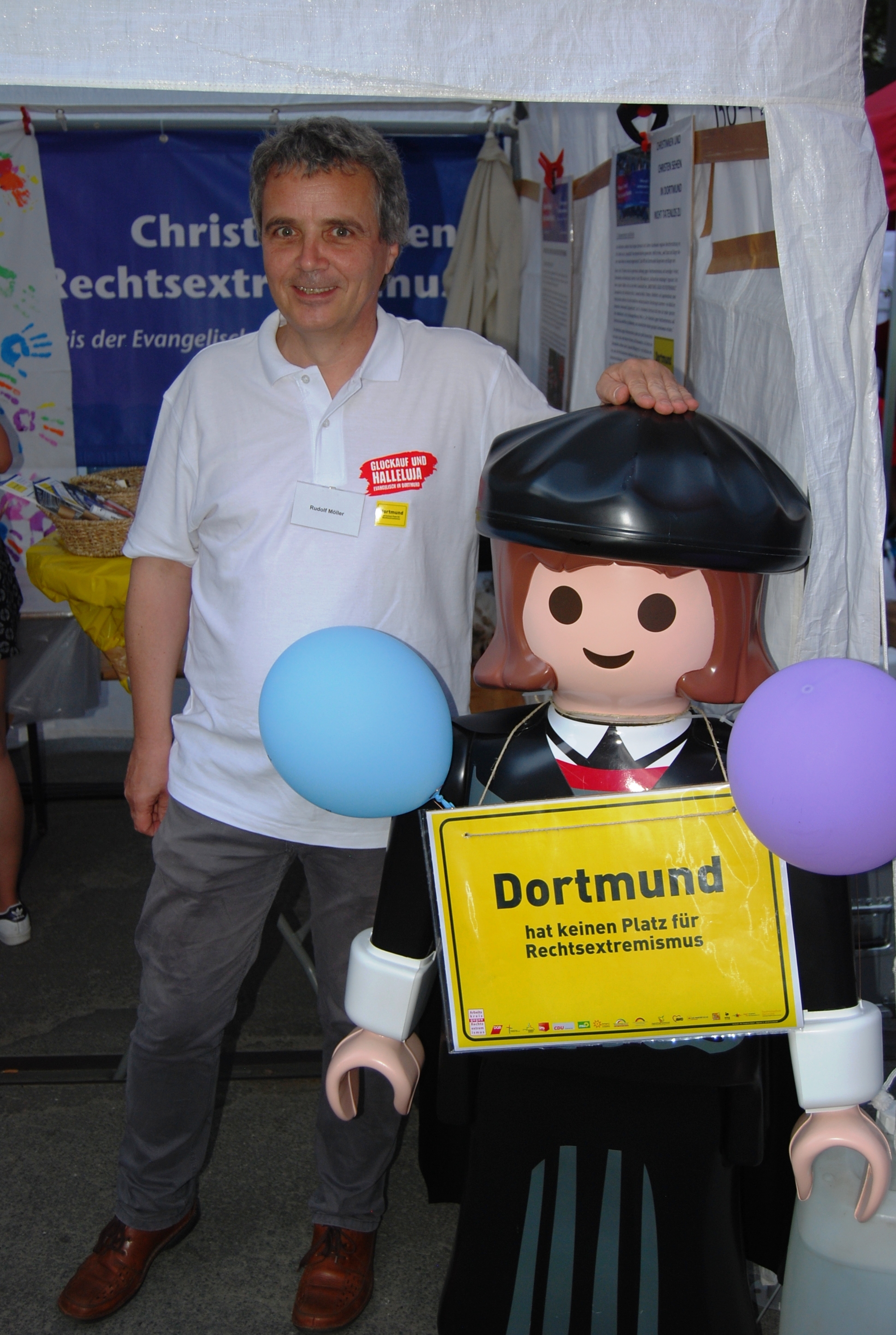 Das ist, wie gesagt, kein alles überlagerndes Thema. Aber eins, mit dem sich Kirchentagsbesucher aus allen Teilen der Bundesrepublik sehr ernsthaft befassen, wo sie, wie es scheint, gar nicht genug an Informationen bekommen können. Die meisten wissen, dass die 600.000-Einwohner-Stadt Dortmund ein Problem mit einer kleinen, aber brandgefährlichen Nazi-Szene hat, die zuweilen mit dem – irrwitzigen – Anspruch auftritt, Dortmund sei ihre Stadt. Jetzt, beim Kirchentag, ist zu erfahren, wie sich eine sehr engagierte Stadtgesellschaft seit 20 Jahren dagegen zur Wehr setzt. Dazu gehört auch der vor einigen Jahren gegründete Arbeitskreis „Christen gegen Rechtsextremismus“.