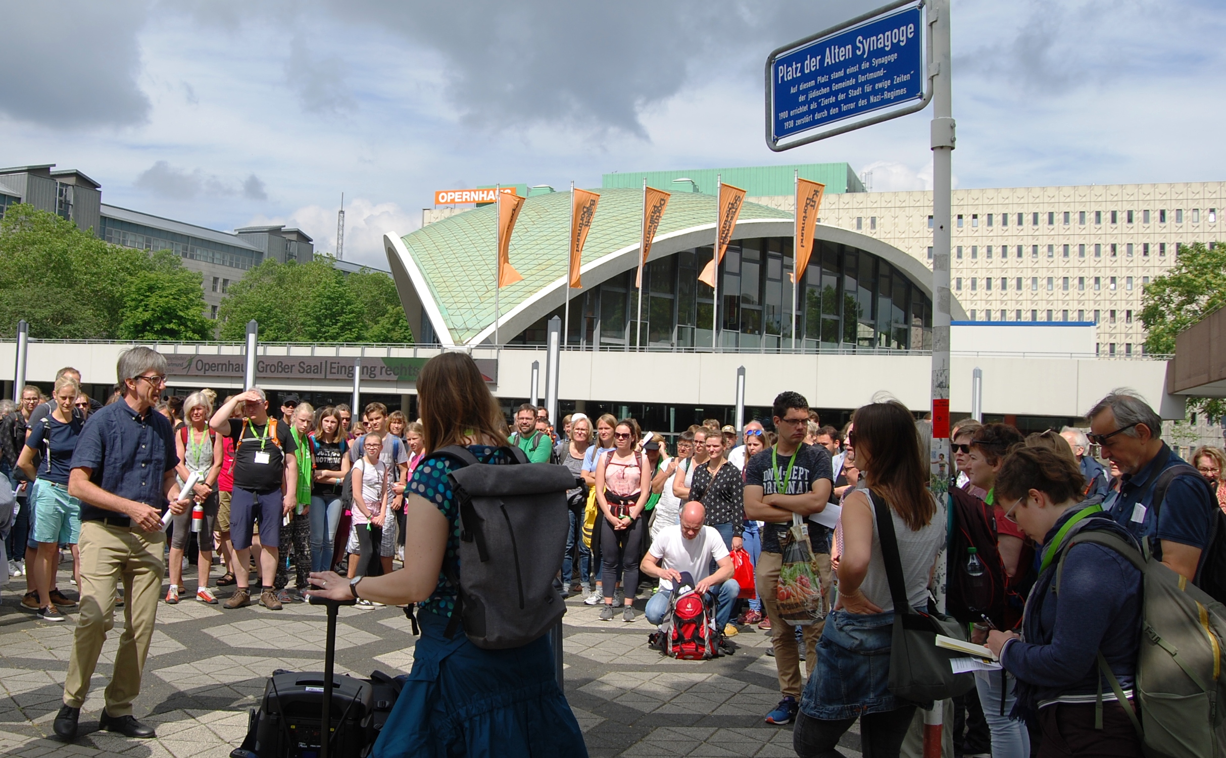 Gleich an der ersten Veranstaltung jedes Kirchentages, dem „Gedenken zu Beginn“ am Mittwoch von 14 bis 15 Uhr, nahmen mit rund 500 Besuchern mehr Menschen teil als bei früheren Kirchentagen. Das Gedenken findet traditionell an Orten statt, die während der Nazi-Diktatur zwischen 1933 und 1945 für furchtbare Verbrechen standen. In Dortmund war das die „Steinwache“ hinter dem Hauptbahnhof, ein berüchtigter Folterkeller der Gestapo. Unmittelbar vor der Steinwache, die heute eine Mahn- und Gedenkstätte ist, befindet sich seit wenigen Jahren ein Mahnmal für die vom NSU in Deutschland ermordeten zehn Menschen. Zu diesen Opfern gehörte Mehmet Kubaşik, der in seinem Kiosk in der Dortmunder Nordstadt, nur wenige hundert Meter von hier, erschossen worden war.