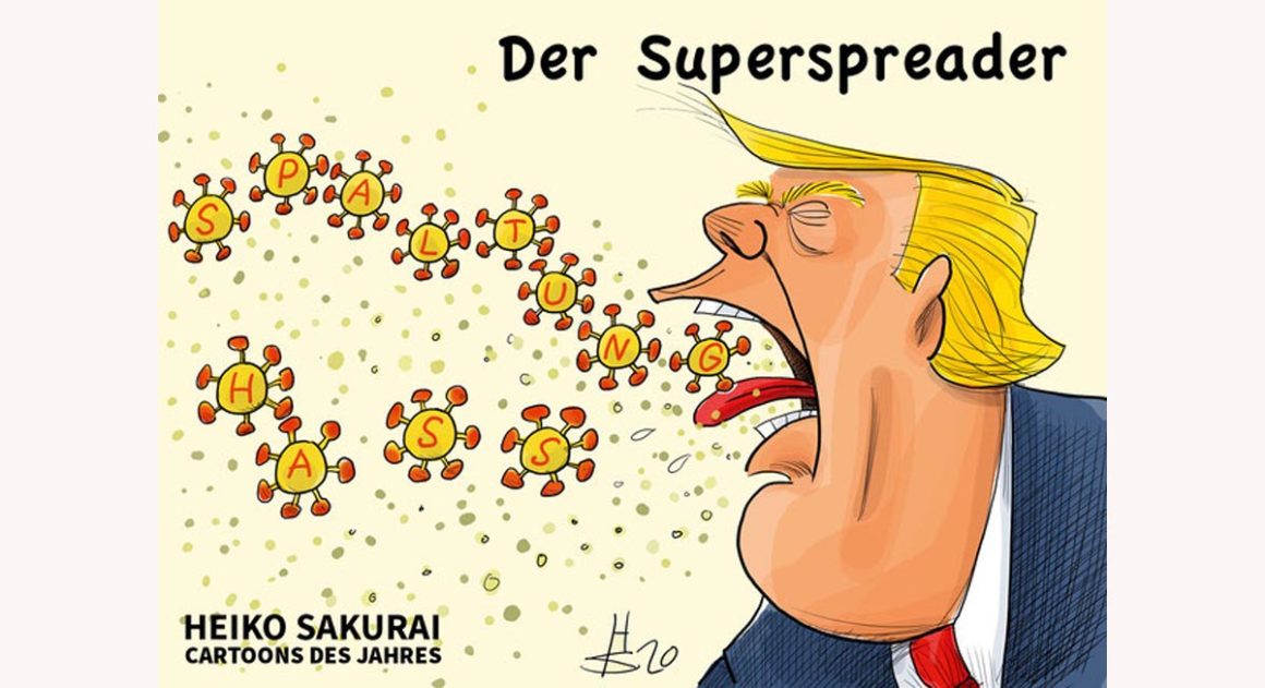 „Der Superspreader“. So kann man einen Jahresrückblick auch betiteln, wenn man ein findiger Karikaturist ist wie Heiko Sakurai. Eine Rückblende, die mir in Buch-Form vorliegt. Man muss die Hauptfigur nicht mögen, aber dennoch steht Donald Trump im Zentrum des Buches, aufgespießt eben von Sakurai. Und er zeigt Donald Trump, wie er leibt und lebt, ungeschminkt, abstoßend. Ich. Ich. Ich. Ein Bild, das alles sagt: Der Superspreader reißt das Maul auf und spuckt quasi all seine Verachtung den Leuten entgegen, um in seiner brutalen Art klarzumachen, was er politisch will: Spaltung und Hass. Ein US-Präsident als Demokratieverächter, weltweit berüchtigt auch als Lügner, der die verlorene Wahl gegen Joe Biden nicht anerkennt, weil er ohne Beweise seit Wochen behauptet, man habe ihm die Wahl gestohlen. Der Lügner spricht von Betrug, es wäre zum Lachen, wenn es nicht so ernst wäre. Trump sitzt als US -Präsident schließlich am Hebel der Macht.