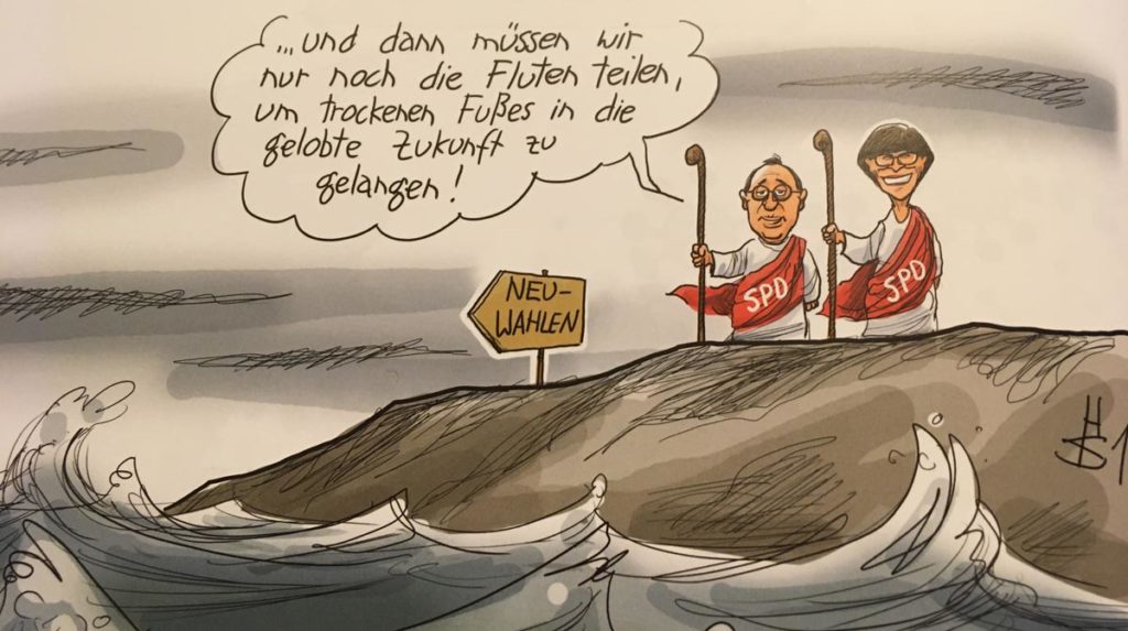 Neben Amerika nimmt Heiko Sakurai in seinem Rückblick die neue SPD-Führung auf die Hörner (oder besser auf die Feder?). Die Sprechblase über Nowabo und Esken in einem Boot in stürmischer See sagt alles: „… und dann müssen wir nur noch die Fluten teilen, um trockenen Fußes in die gelobte Zukunft zu gelangen.“