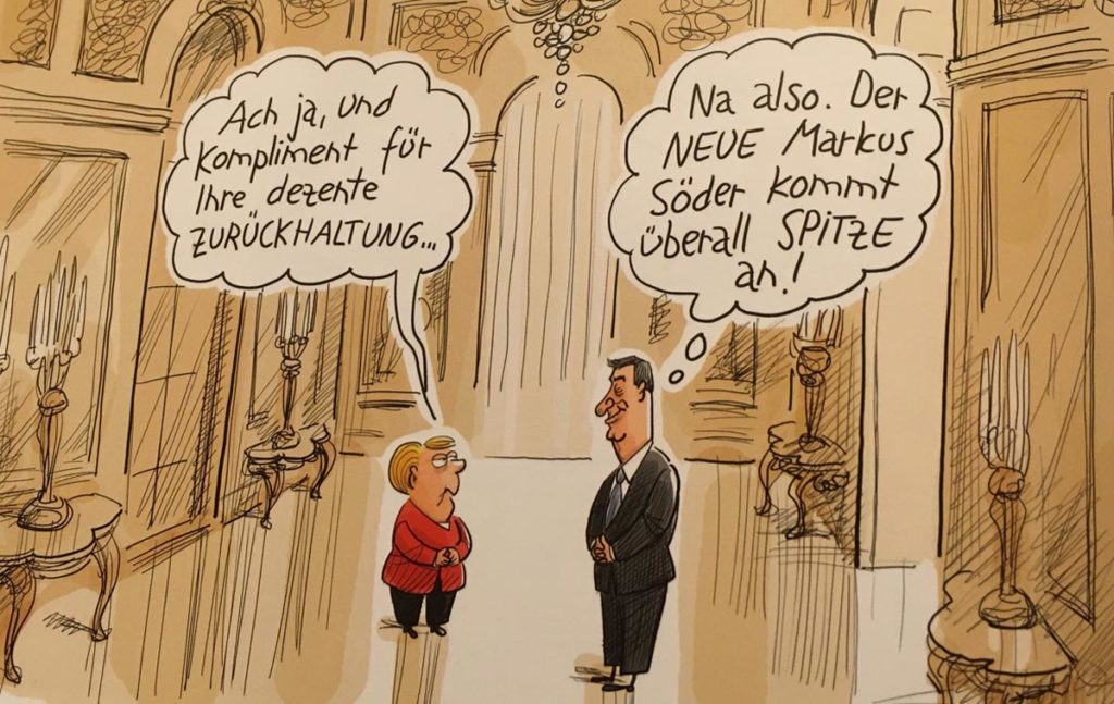 Normalerweise ist die Kanzlerin-oder der Kanzler- das Lieblingsobjekt eines jeden Zeichners. Das traf auf Angela Merkel alle Jahre zu wie vorher auf Helmut Kohl und Gerhard Schröder. Wenn man genau hinschaute, sah man bei Kohl in der Karikatur die Birne durch, bei Schröder war es der kantige Kopf, der auffiel, bei Merkel ist es die etwas herungerhängende Unterlippe, die der Zeichner dezent ins Bild setzt. Angela Merkel ist auch dieses Jahr ein herausragendes Thema in Sakurais Karikaturen-Rückblende. Sie dreht ihre letzte Runde, wenn man will, der Zeichner bringt sie immer wieder in Spiel auch bei der Suche nach einem neuen CDU-Vorsitzenden.Wobei es im Grunde ja um ihre eigene Nachfolge geht, denn der CDU-Chef hat ja auch den ersten Zugriff auf die Kanzlerkandidatur. Allerdings ist dieses Mal einiges anders, weil die von Merkel zunächst ausgesuchte Annegret Kramp-Karrenbauer es nicht geschafft hat, den CDU-Karren zu ziehen. Jetzt stehen nur Männer zur Verfügung, der Merz, der Röttgen, ja und der Laschet. Sakurai bringt sie ins Bild und zeigt das ganze Durcheinander in der Union, er zeigt auch den Armin Laschet, der als Favorit gestartet war, aber dann ins Hintertreffen geraten ist. Man sieht ihn in der Zeichnung, als suchte er Trost. Die langen Gespräche der Kanzlerin mit den Ministerpräsidenten über die Pandemie und wie man ihr begegnen soll angesichts von vielen Toten und täglich Tausenden von Infektionen sind ein heikles Thema, das man mit Fingerspitzen-Gefühl und Anstand, ohne andere zu verletzen, in eine Zeichnung bringen muss. Ein Friedhof ist ein Ort der Stille. Markus Söder, der Bayer aus Nürnberg, hat sich nach vorn gearbeitet, entsprechend findet er bei den Zeichnern statt, im Kampf mit dem Virus, dann fechtend mit Armin Laschet. Wer hier gewinnt, ist völlig offen.