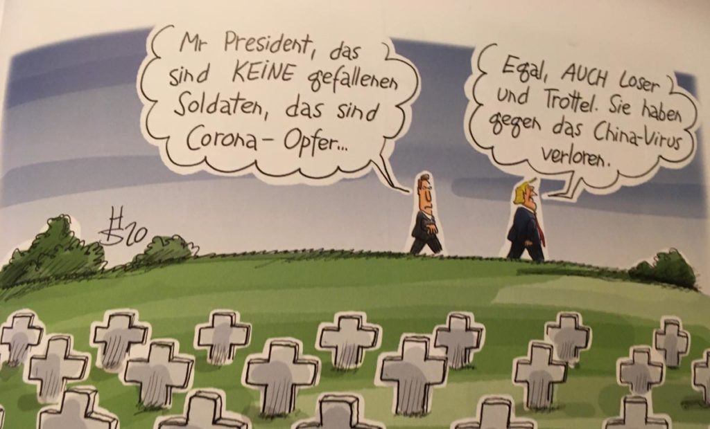 Spaltung, Hass und Lüge, diese Untugenden stehen für einen Präsidenten, den selbst die Pandemie mit Tausenden von Toten im Grunde nicht interessiert. Sonst hätte er keine Witze gemacht darüber, oder meinte er es im Ernst, als er davon faselte, mit dem Schlucken von Spülmitteln sich gegen das Virus zu schützen? Der Zeichner bringt es auf den Punkt, gemeint den Strich.