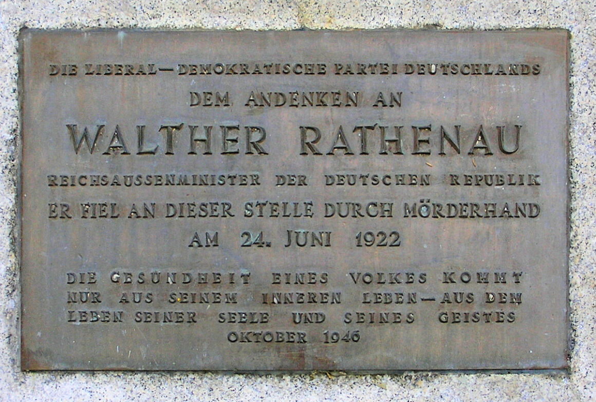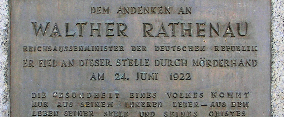 Rathenau, ein Intellektueller und Industrieller, sein Vater Emil war der Gründer der AEG, verkörperte in den Augen seiner Mörder die Erfüllungspolitik und eben die Weimarer Republik, „er war der Repräsentant alles dessen, was sie hassten“(Heinrich August Winkler). Er war zudem Jude, ein Kritiker des alten, untergegangenen Deutschlands, das nicht wahrhaben wollte, dass man den Krieg verloren hatte. Sie hatten ihn ja auch in Belgien und Frankreich geführt, dort standen die deutschen Truppen und im Reich erzählte man sich die Geschichten vom bevorstehenden Sieg, aus dem dann die bittere Niederlage und der Waffenstillstand mit all den schweren Lasten wurde, was man als Demütigung empfand. Dabei war Rathenau eine Persönlichkeit, ein deutscher Patriot, der Versailles überwinden wollte(Winkler). Er wusste um die Gefahr eines Anschlags, es fehlte ja nicht an Drohungen gegen ihn, die er kannte und sie Wochen vor dem Attentat einem britischen Offizier anvertraut hatte: „In einigen Teilen meines Landes marschieren Kompanien von Männern im Rhythmus der Worte: Schlagt tot den Walther Rathenau, die gottverdammte Judensau.“ Dennoch verzichtete Rathenau auf Schutzmaßnahmen. Die Mörder Rathenaus wurden gestellt, ein Oberleutnant zur See und ein Leutnant der Reserve, der eine starb durch Kugeln seiner Verfolger, der andere nahm sich das Leben.