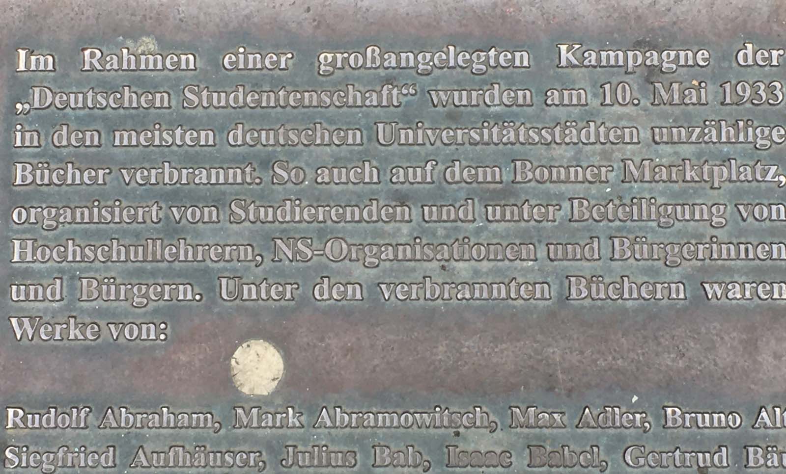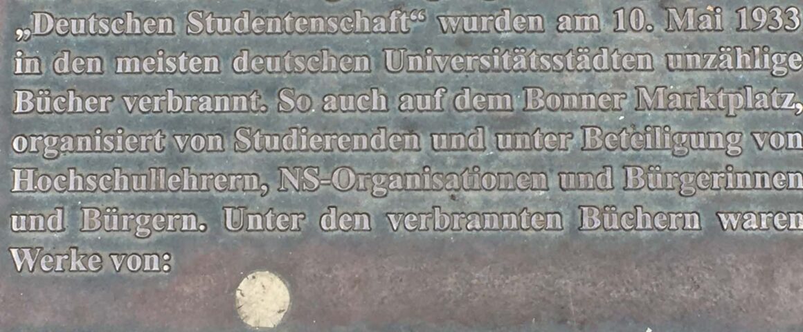 1947, als Deutschland von den Alliierten vom Joch der Nazi-Diktatur befreit worden war, sprach Peter Suhrkamp auf dem Opernplatz in Berlin: “ Die Flammen, die zuerst über den Bücherhaufen prasselten, verschlangen später im Feuersturm unsere Städte, menschliche Behausungen, die Menschen selbst. Nicht der Tag der Bücherverbrennung allein muss im Gedächtnis behalten werden, sondern diese Kette: von dem Lustfeuer an diesem Platz über die Synagogenbrände zu den Feuern vom Himmel auf die Städte.“ Stellvertretend für viele Gedenktafeln sei hier das Denkmal zur Erinnerung an die Bücherverbrennung in Berlin auf dem Bebelplatz neben der Staatsoper erwähnt. Dort erinnert eine ins Pflaster eingelassene Glasplatte an die Bücherverbrennung vom 10. Mai 1933. Wenn man durch die Glasplatte schaut, sieht der Besucher das aus leeren Bücherregalen bestehende Mahnmal „Bibliothek“ des israelischen Künstlers Micha Ullmann. Auf zwei in den Boden eingelassenen Bronzetafeln kann man den Satz von Heinrich Heine in seiner Tragödie „Almansor“ lesen: Dort, wo man Bücher verbrennt, verbrennt man auch am Ende Menschen.“ Die düstere Prognose des Dichters stammt aus dem Jahre 1820.