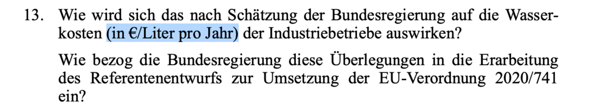 - Und es ist mehr als unüblich, ja sogar unsinnig bei den Kosteneinsparungen auf Dimension „in €/Liter“ abzustellen; die zeitliche Dimension „pro Jahr“ macht die Sache nicht besser (Frage 13). Da die Fragesteller konkret nach den Kosteneinsparungen beim Wasserentnahmeentgelt fragen, hier die Antwort: Das Wasserentnahmeentgelt beträgt 0,05 Euro pro Kubikmeter in NRW. Die Einsparung betrüge demzufolge 0,00005 Euro pro Liter. Wieviele Euro es im Jahr sind, hängt dann verständlicherweise von der Menge ab.