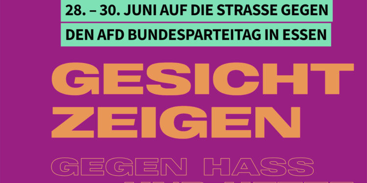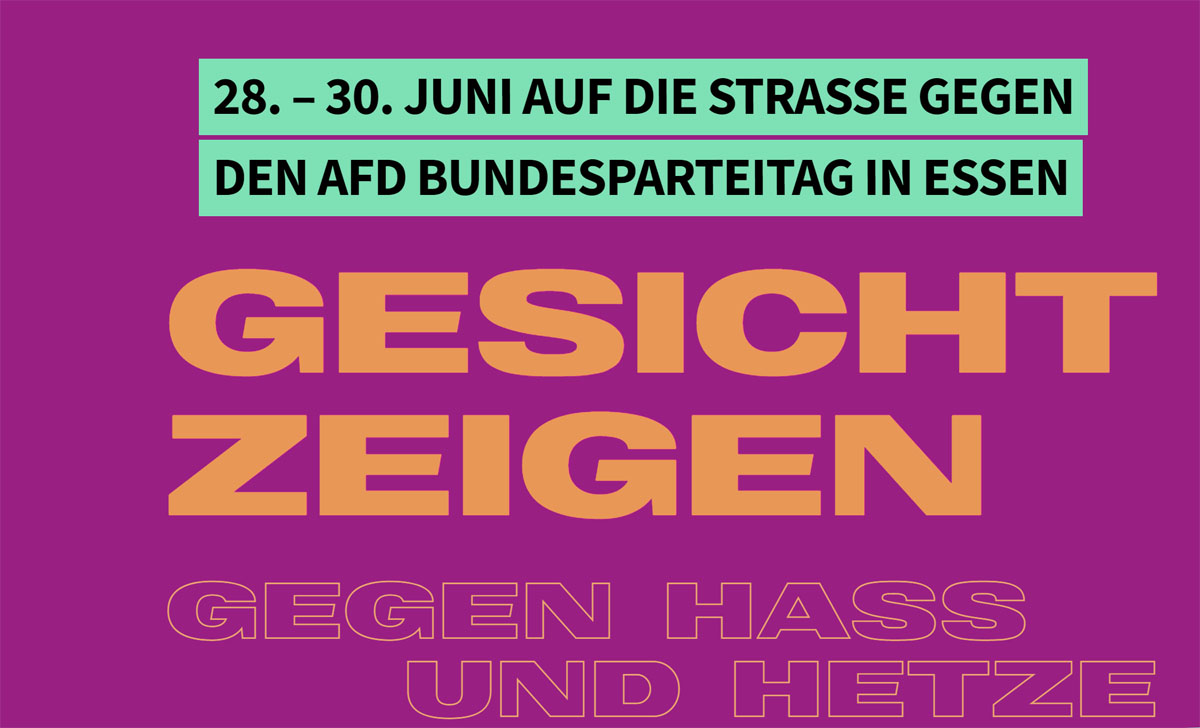 Vom 28. bis 30. Juni 2024 will die AfD in der Messe Essen – im Herzen des Ruhrgebiets – ihren Bundesparteitag abhalten. Dagegen stehen viele aufrechte Demokraten und demokratische Organisationen ein. Gesicht zeigen gegen Hass und Hetze ist das Gebot der Stunde. Nie wieder ist Jetzt! Gerne veröffentlichen wir auch hier den Aufruf gegen den Rassismus, den Hass und antidemokratische Gesinnung der AfD.