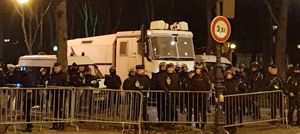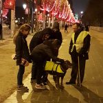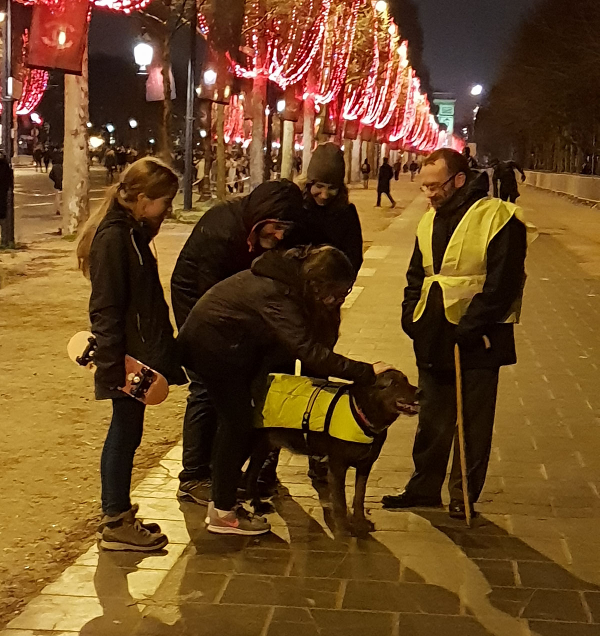 Hund in einer „Gilets jaunes“ mit seinem Besitzer, einem Prototyp des Rentnerprotests, über die Champs-Élysées nach Hause. Trotz in Alarmbereitschaft befindlicher Hundertschaften von Polizisten und Sonderkommandos in den Seitenstraßen und Parkflächen der Pariser Prachtstraße fielen etliche, mit Smartphone bewaffnete Touristen und andere friedliche Neujahrsfeierer über dieses Fotomotiv her. Dem alten Gelbwesten-Rentner flogen die Sympathien zu und der Hund wurde in einem bizarren Moment, kurz vor den auch in der Neujahrsnacht neu aufflammenden Gewaltprotesten, zum betätschelten und liebkosten Hauptakteur des Protestes.