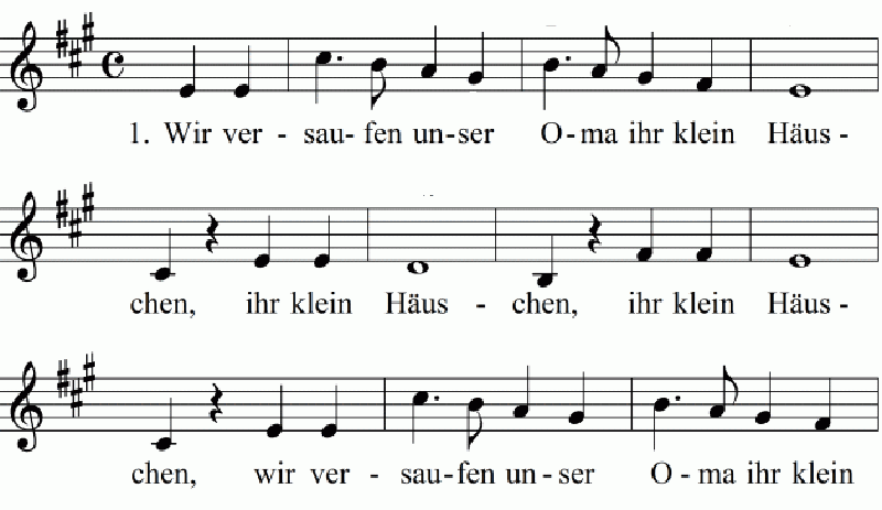 Aus dem klein-Häuschen der Oma wurde im musikalischen Geschiebe und Getriebe der späten zwanziger Jahre die eigentlich sinnfreie, vielleicht ein wenig anti-modernistische Parodie: „Meine Oma fährt Motorrad ohne Bremse…“, die wiederum nach dem zweiten Weltkrieg in das Blödsinns-Lied um- getextet wurde: „Meine Oma fährt im Hühnerstall Motorrad.“ Von Satire war da keine Rede. Der Blödsinn wird in der dritten Zeile schließlich wieder „geheilt“, sozusagen: „Meine Oma ist ’ne ganz patente Frau.“