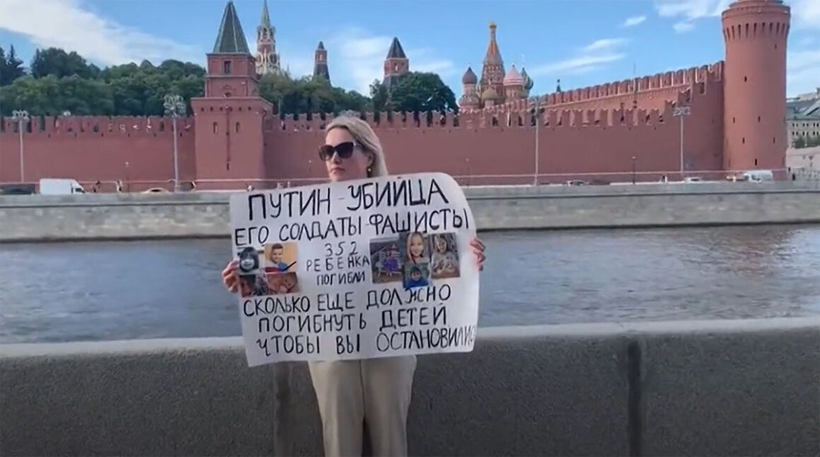 das sie mit einem Plakat in der Hand an einer Uferpromenade in Moskau zeigt. Im Hintergrund ist sie demonstrierend auf der anderen Fluss-Seite des Kreml zu sehen. „Putin ist ein Mörder“, steht auf dem Plakat – und: „Seine Soldaten sind Faschisten.“ und „Wie viele Kinder müssen noch sterben, bis ihr aufhört?“