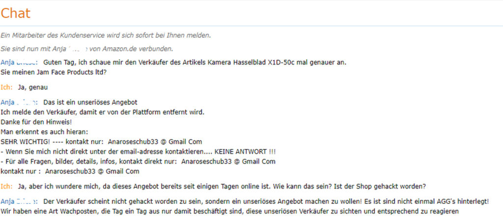Der Kundendienst von Amazon verweist zwar auf einen „Wachtposten“ (wörtliches Zitat), der speziell solche betrügerischen Accounts sucht und entfernt. Allerdings wurde in einem Chat zu der Problematik von einem Servicemitarbeiter beklagt, dass das nicht automatisiert erfolge. Amazon sucht wirklich (auch im 21. Jhd.) „händisch“ nach solchen Angeboten und ist offenbar auch auf die Unterstützung externer Anbieter angewiesen.