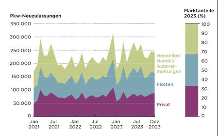 Da werden, die Abbildung zeigt es, überwiegend „In-House“-Absätze getätigt – nur knapp 30 % gehen wirklich an Private. Insofern haben die Unternehmen nicht wirklich ein Problem, Neuwagen in einer Höhe, die ihren Interessen entspricht, zuzulassen. Ein Problem ist eher das Weiterreichen als Gebrauchtwagen, die erst gehen zu über 90% an Private. Da erst geht es um ausgehandelte Preise.