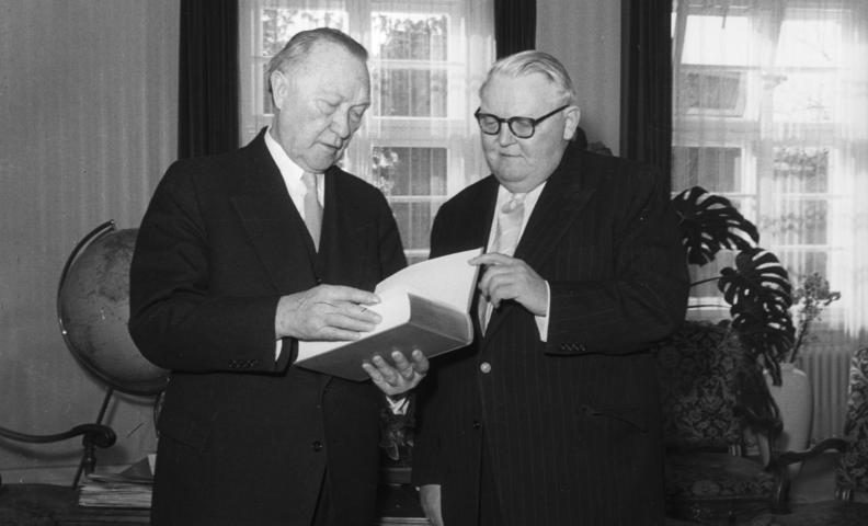 Bundeskanzler Konrad Adenauer liest interessiert in dem Buch, das ihm Bundes-Wirtschaftsminister Prof. Erhard als Geburtstagsgeschenk überreichte.