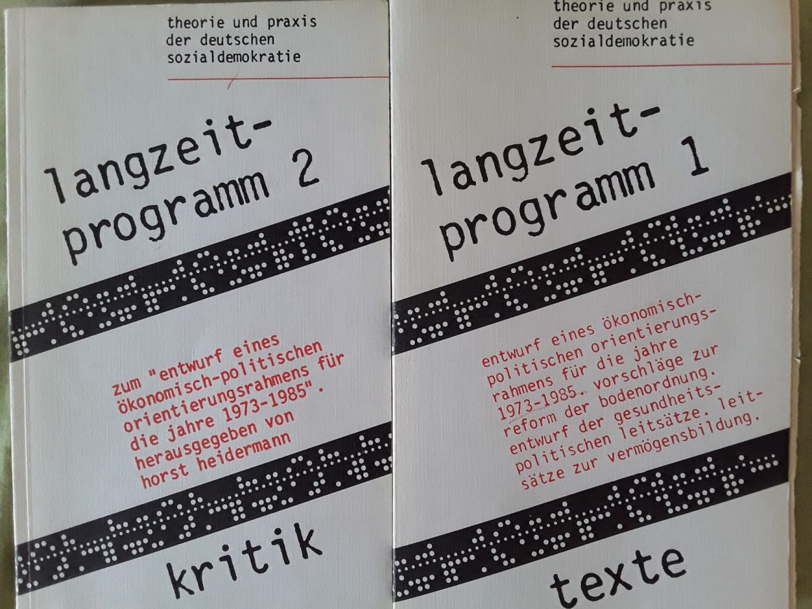 Auch darüber haben die deutschen Sozialdemokraten schon seit Jahrzehnten nicht nur nachgedacht. Es wurde öffentlich diskutiert, aufgeschrieben und auf zahlreiche Parteitagen beschlossen. Im auf zwölf Jahre konzipierten Langzeitprogramm 1 wird eine spürbare Beteiligung am „wachsenden Produktivvermögen“ gefordert. So steht es im „ökonomisch-politischen Orientierungsrahmen“, den eine Kommission unter dem Vorsitz des Diplom-Volkswirt Helmut Schmidt und späteren Bundeskanzler erarbeitete. Kein starrer Plan.