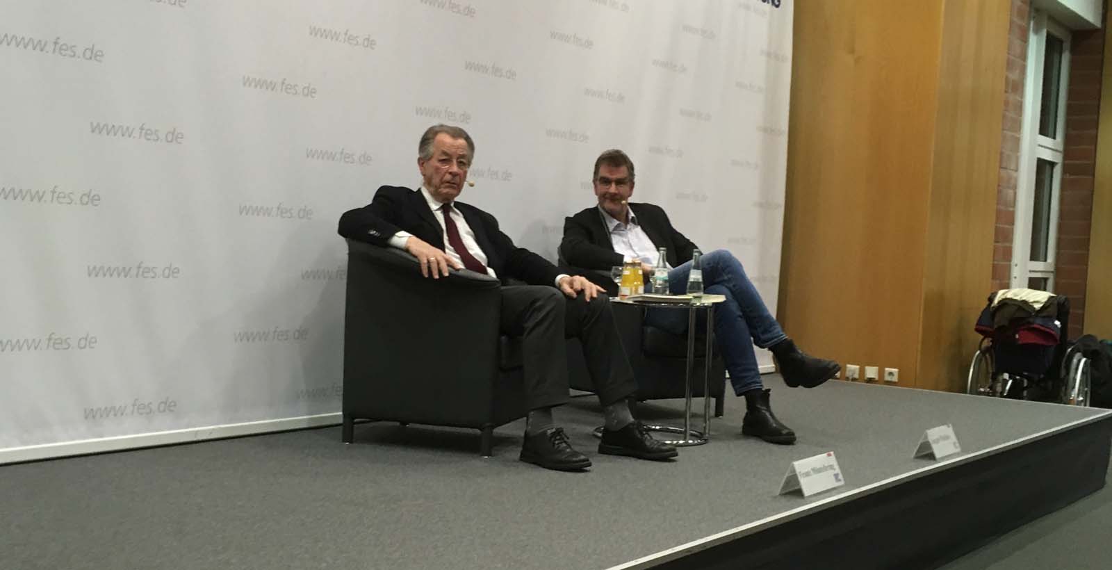Der SPD rät er von Gedankenspielen ab, die Große Koalition vorzeitig zu verlassen. Im Herbst will man ja Bilanz ziehen. Der Hobby-Fußballer Müntefering meint: „Wer zur Halbzeit nicht wieder auf den Platz kommt, hat wenig Chancen zu gewinnen.. Die Zahl der Zuschauer wird abnehmen. Die der Wählerinnen und Wähler auch. Er gerät in Vergessenheit.“ Damit die SPD aus der Krise findet, müsse sie wieder Volkspartei sein. Der Fehler der Partei sei, dass die SPD sich „zu gern schmal statt breit“ mache. Die Werte der Partei müssten immer mal wieder herausgestellt werden: Freiheit, Gerechtigkeit, Solidarität. Die Menschen müssten erfahren, wohin die Reise gehe. Man müsse „entschlossen handeln, sammeln und führen. Es gibt Themen und Bedarf. Noch mal: Fangt an!“