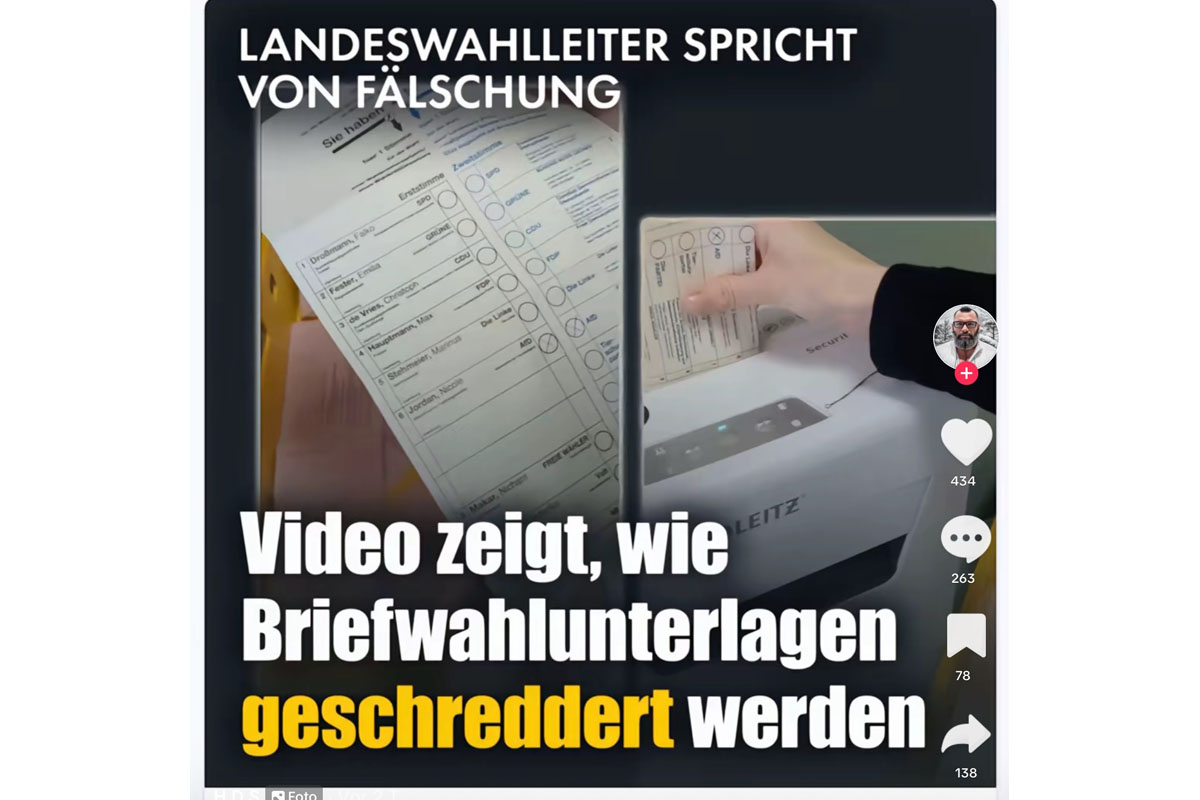 Unterstützt wird die Mär vom möglichen Wahlbetrug durch Fake-Videos in den sozialen Medien: Aktuell ermittelt das Landeskriminalamt Sachsen gegen die Herausgeber eines Videos, in dem behauptet wird, dass ein Wahlzettel ohne AfD bei der Briefwahl in Leipzig verteilt werde. Kenner erkennen schnell, dass es sich um einen Fake handelt, denn der Wahlzettel fängt nicht mit „1“ sondern mit „2“ an. Beobachter vermuten russische Interessen hinter diesen Fake-Videos. Beliebt sind auch Videos, bei denen ausgefüllte Wahlzettel im Müll gefilmt werden oder nicht erkennbare Personen Stimmzettel mit Kreuzen bei der AfD in den Schredder schieben.