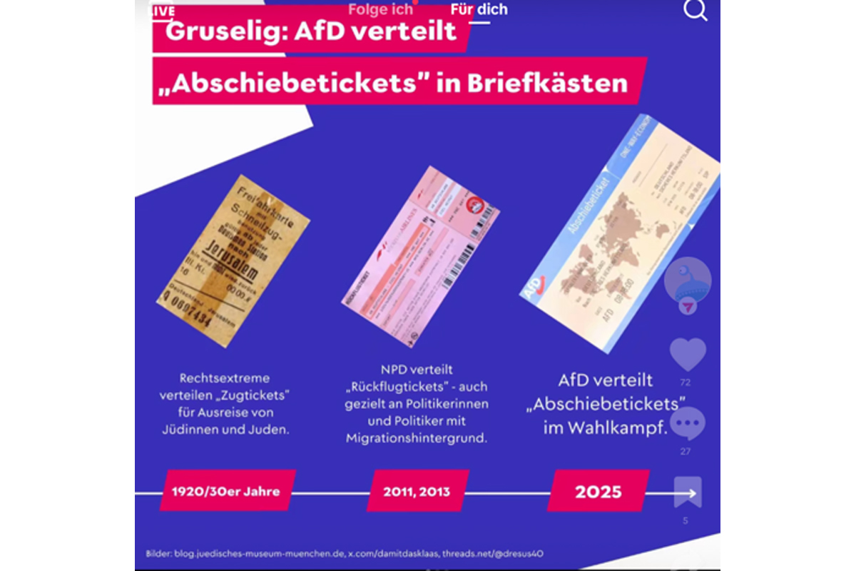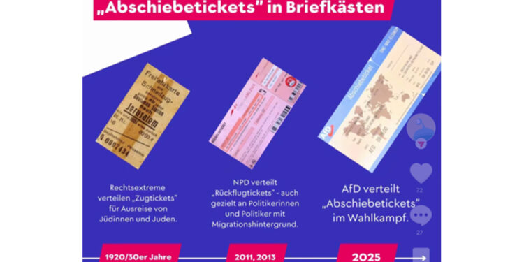 „Abschiebeticket – One Way Economy. Von Deutschland in ein sicheres Herkunftsland“, schreibt die AfD auf ihre Variante des Tickets. Verteilt wurden sie ebenfalls in Briefkästen mit ausländisch klingenden Namen. In Karlsruhe ermitteln Polizei und Staatsanwaltschaft – 20 Anzeigen wegen Volksverhetzung liegen dort vor.