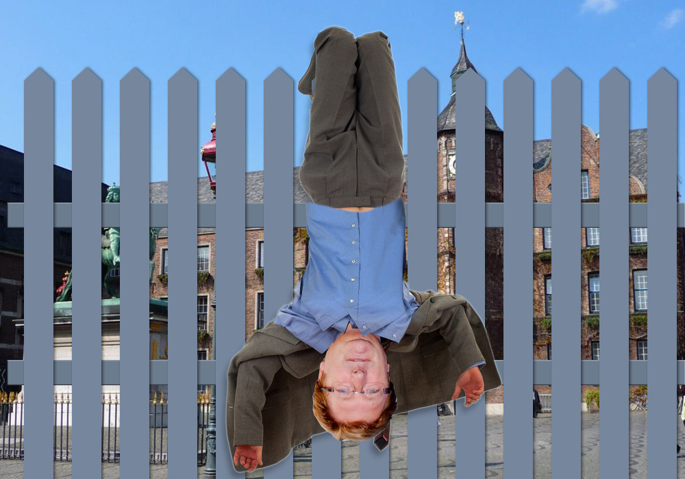 So ist das, Herr Elbers, wenn man den Boden unter den Füßen verliert und sich für unschlagbar hält. Wenn man daher schwadroniert, im Ruhrgebiet möchte er nicht tot überm Zaun hängen. Wenn man wie Elbers Schilder an den Stadtgrenzen aufstellen lässt,auf denen geschrieben steht: „Sie verlassen jetzt den schuldenfreien Sektor.“ Doch wer den Schaden hat,nicht wahr Herr Elbers, der spottet jeder Beschreibung. So musste er sich am Tag seines politischen Desasters von Hannelore Kraft daran erinnern lassen, wer dem reichen, aber sturmverwüsteten Düsseldorf gerade aus dem ärmlichen Umland so alles beim Aufräumen helfe.