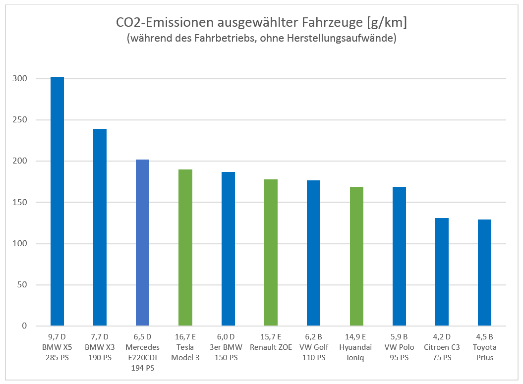 Für die CO2-Emissionen des fossilen Strommixes werden daher 1136 g/kWh Stromverbrauch des Fahrzeugs angenommen.