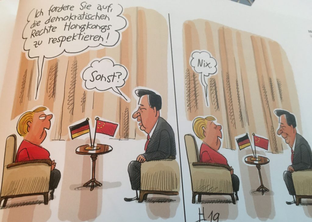 Von Kohl zu Schröder zu Merkel. Das Lieblingskind der Karikaturisten ist immer der Kanzler und die Kanzlerin. Man merkt es dem Zeichner an, wenn ein anderer Chef im Kanzleramt sitzt, er muss erst die Besonderheiten, den Charakter des Politikers wie im Schlaf kennen, dessen Art zu regieren und mit den Leuten umzugehen. Dann flutscht die Zeichnung, dann werden die Gesichtszüge klarer, die herunterhängende Lippe von Merkel, die kantige Form von Schröder. Sie die Mutti, er der Basta-Kanzler. Der Karikaturist ist nicht der Moralist, nicht der Scharfrichter, sondern irgendwo dazwischen. Oder- ich zitiere noch einmal Manfred Fritz aus dem Vorwtort des Jahres-Cartoon-Buches: „Seine Art, das ist für den in Köln wohnenden Künstler die sprichwörtlich rheinische. Nicht mit dem Hammer des Bierernsten geht er die Weltprobleme und deren Akteure an. Auch feiner Humor und die gekonnte Preisgabe an die Lächerlichkeit können Wirkungstreffer erzielen.“