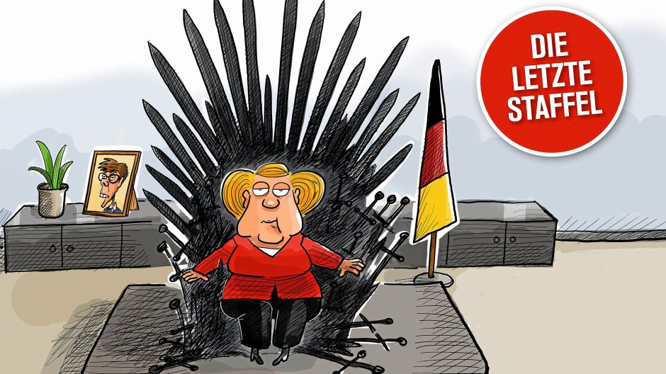 Vor Jahr und Tag schuf Heiko Sakurai eine Karikatur, die jetzt aktueller denn je werden könnte. Sie zeigt den Altkanzler Gerhard Schröder auf dem Sockel stehend, seine Nachfolgerin Angela Merkel geht mit der Aktenmappe vorbei und Schröder ruft ihr nach: „Noch sind Sie Kanzlerin. Aber irgendwann is immer Ende!“