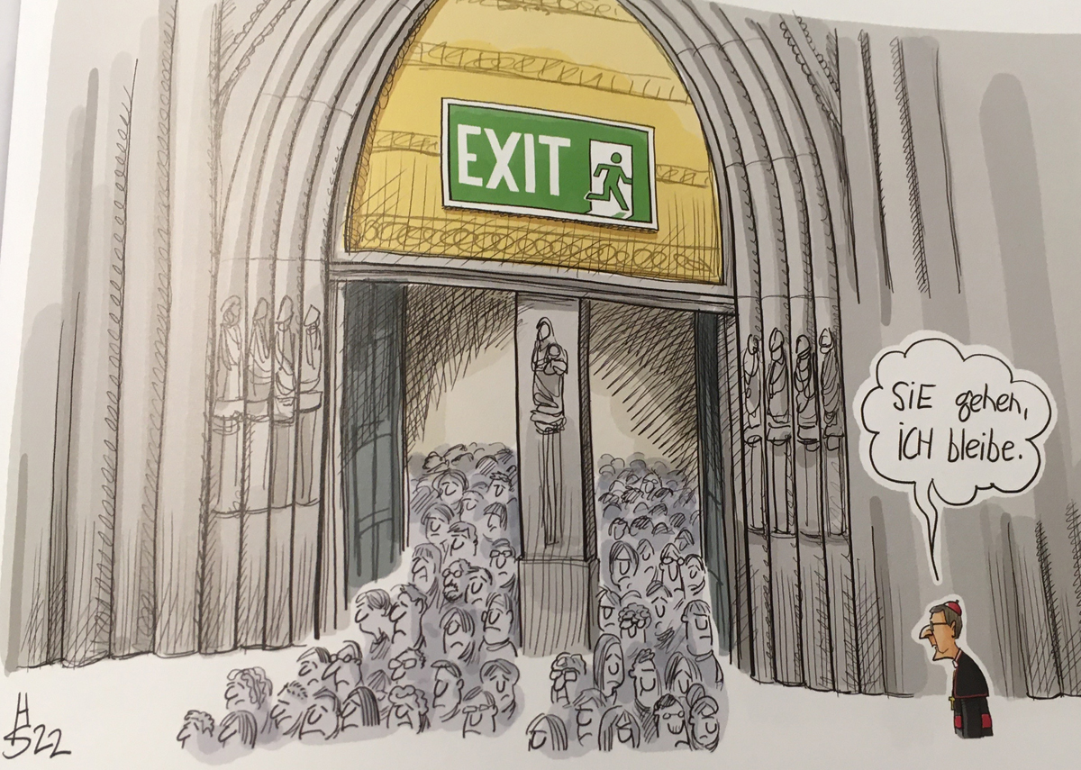 Werfen wir einen Blick in Sakurais Cartoons des Jahres2022. Stichwort Glaubwürdigkeit der katholischen Kirche. Man sieht den ehemaligen Papst Benedikt in seiner Kanzel auf den Trümmern der Kirche, zusammengebrochen nach dem Gutachten zu den Missbrauchsopfern im Erzbistum München und Freising, das Ratzinger schwer belastet, während er selber von Unkenntnis spricht. Oder nehmen wir den Kölner Erzbischof Wölki. Sie gehen, ich bleibe, sagt die Sprechblase und zeigt die Massen, die die Kirche verlassen und den umstrittenen Kardinal der Domstadt.