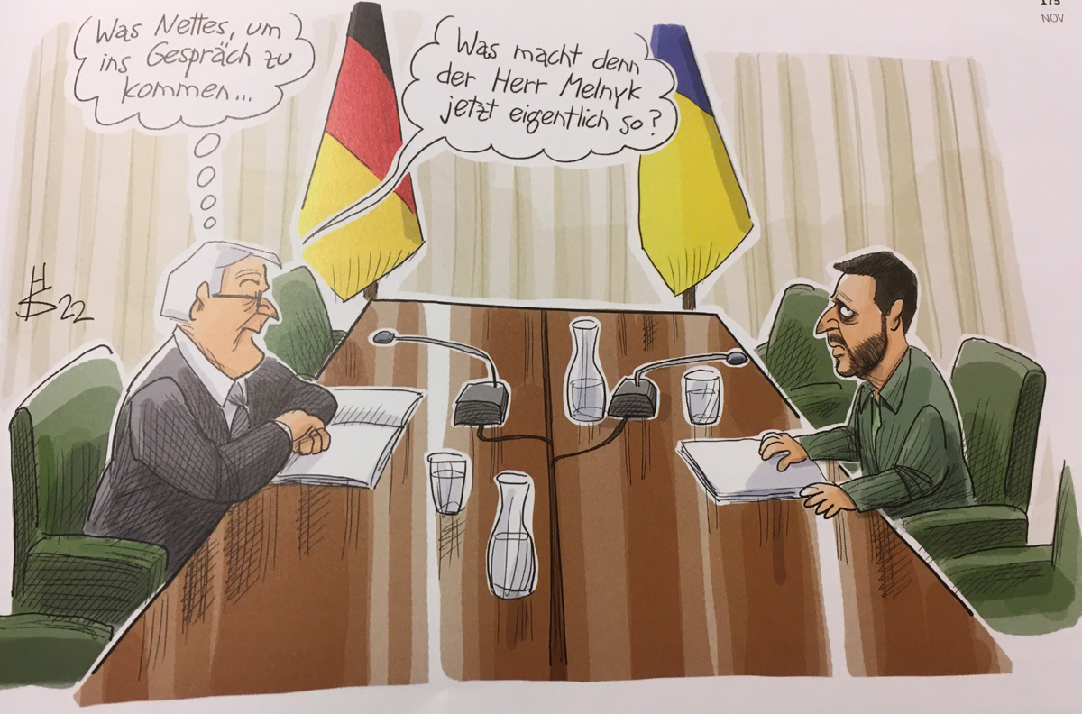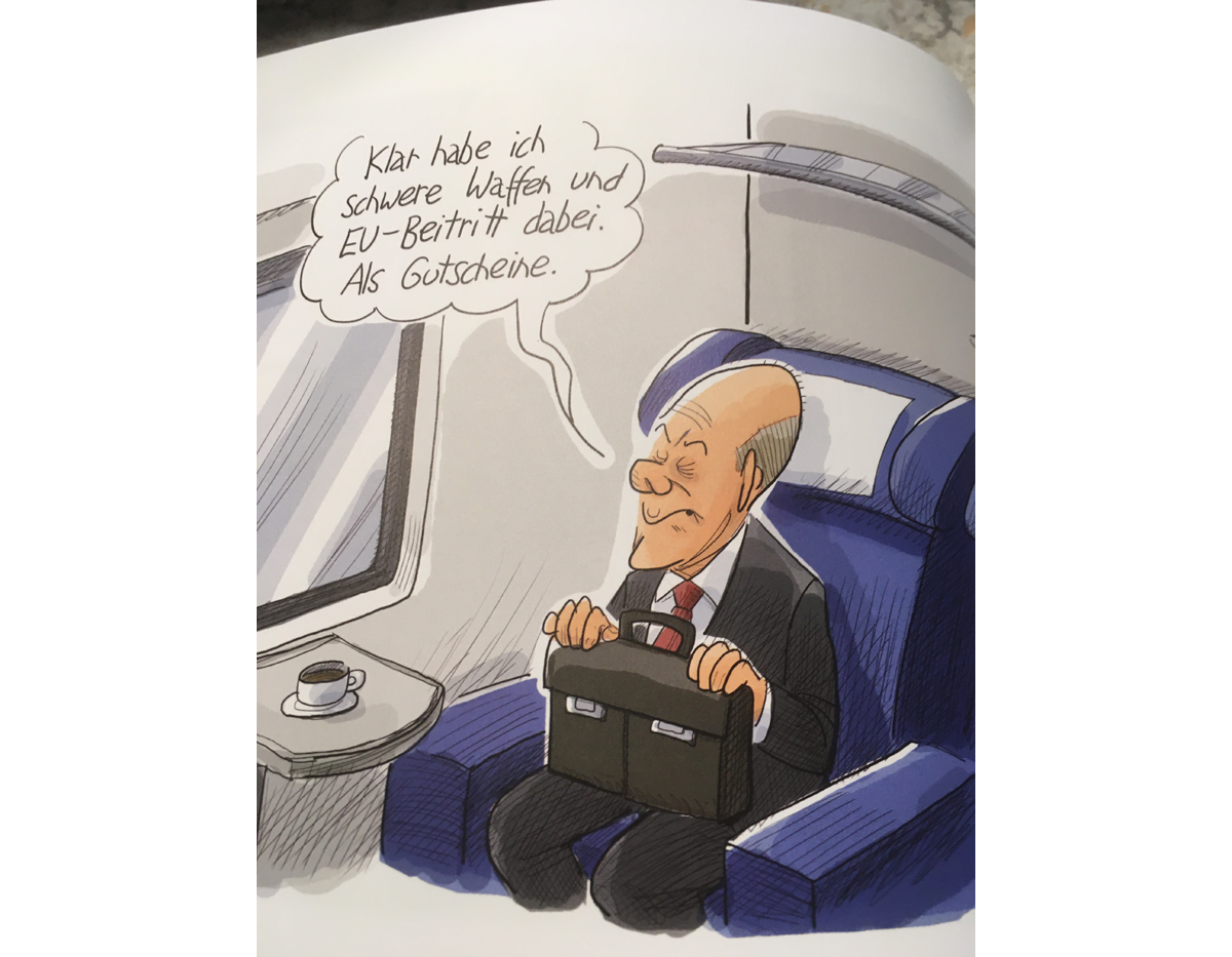Die Ampel-Regierung ist natürlich ein Thema. Eines Morgens wacht sie auf und sieht verwandelt aus, sie trägt olivgrün und einen Stahlhelm. Sagen Sie Präsident Selenskyj, sehen wir die Sprechblase von Verteidigungsministerin Lambrecht, “ wir können ihm alles liefern, was wir haben: die Zeichnung zeigt einen Helm, ein paar Reifen, eine Panzerfaust. Scholz im Zug auf der Reise nach Kiew, wo er begleitet wurde von Draghi und Macron. In der Karikatur sitzt er allein am Fensterplatz, die Aktentasche auf dem Schoß. Und ihm werden die Worte in den Mund gelegt: „Klar habe ich schwere Waffen und den EU-Beitritt dabei. Als Gutscheine.“