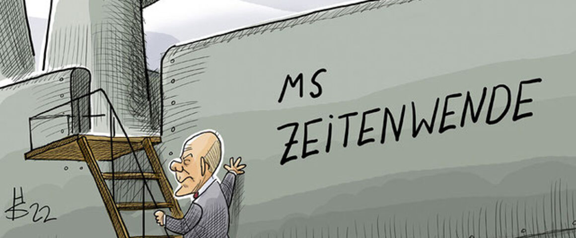 Darauf muss man erstmal kommen: Der Lotse geht an und nicht von Bord. So sieht es jedenfalls der Karikaturist Heiko Sakurai in seinem Jahresrückblick. Der Lotse ist auch nicht wie beim Zeichnungs-Klassiker John Tenniel Otto von Bismarck, sondern es ist Olaf Scholz, der die Gangway raufgeht – auf die MS Zeitenwende, die aussieht wie ein Kriegsschiff, was gewollt ist und zur Rede des Kanzlers Scholz am 24. Februar nach dem Ukraine-Überfall von Russlands Truppen auf Befehl von Präsident Putin passt. Wie das ernste und sorgenvolle, aber entschlossene Gesicht des deutschen Regierungschefs, dessen Amtszeit ja gerade erst begonnen hatte-im Gegensatz zu Bismarck, dem großen Staatenlenker, der von Bord ging und Wilhelm II. das Regiment überließ, höhnisch darüber lachend, wissend oder ahnend, was passieren würde.