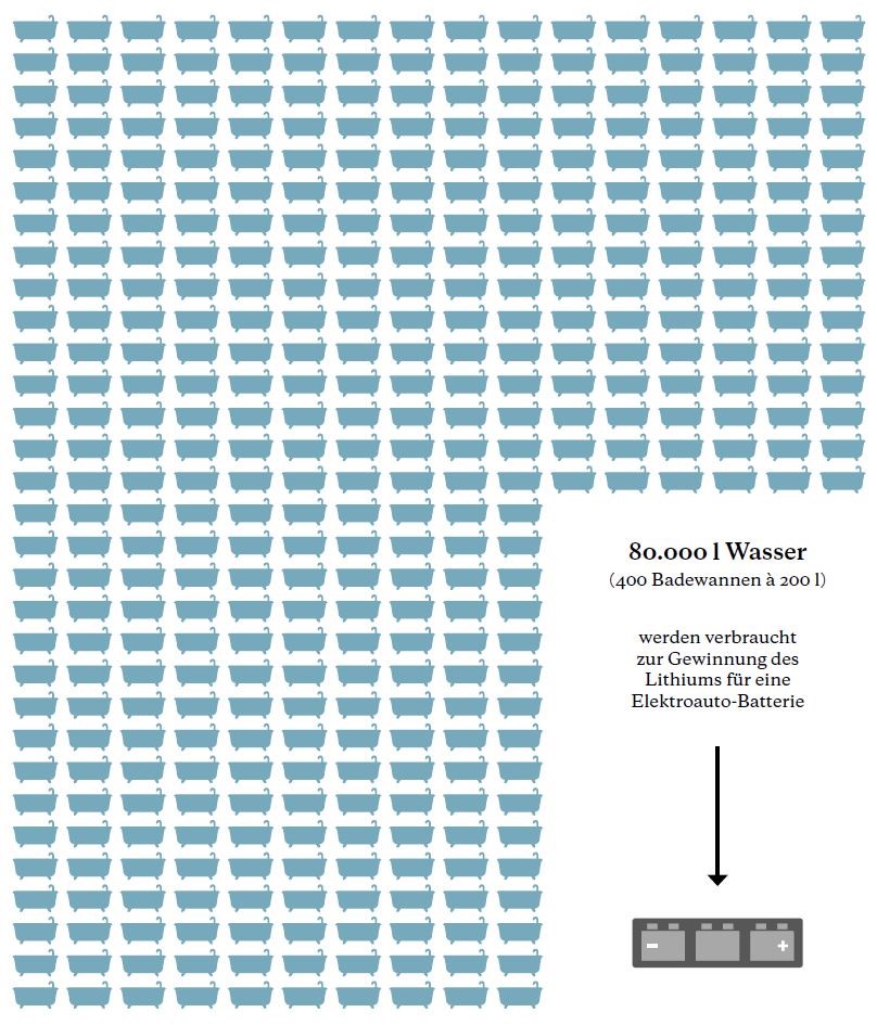 Mit Hilfe von Sonnenenergie, die in diesem Klimabereich das ganze Jahr über reichlich vorhanden ist, wird die Sole so lange konzentriert bis eine Lithium-Konzentration von 5 bis 6 % erreicht ist. Da der Lithiumanteil der Solen mit weniger als 1 % relativ gering ist, dauert dieser Prozess bis zu 12 Monate lang (Epstein 2015). Dabei werden exorbitant große Wassermengen verdunstet. Nach Frankel and Whoriskey (2016) sowie Gallardo (2011, zitiert in Leifker et al. 2018) verdunsten etwa 2 Mio. Liter Wasser für jede Tonne Lithium! In Abb. 2 wird dieser horrend hohe Wasserfußabdruck[1] des Lithiumabbaus plakativ veranschaulicht. Der Abbildung liegt eine Lithium-Ionen-Batterie mit einem Lithiumgehalt von 40 kg zugrunde. Je nach Modell und Hersteller kann dieser zwischen 15 und 40 kg pro Batterie schwanken. Die in Abb. 2 dargestellten 400 Badewannen à 200 l und der daraus resultierende Wasserverbrauch von 80.000 l pro Batterie stellen demnach die Obergrenze des Wasserfußabdrucks dar. Da aber auch bei der industriellen Weiterverarbeitung des Lithiumsalzes zu Lithiumkarbonat Wasser (z. B. zum Waschen vor dem Export, s.u.) zum Einsatz kommt, erscheint der in Abb. 2 zugrunde gelegte Wasserfußabdruck realistisch. Es ist also festzuhalten, dass der Wasserverbrauch beim Lithiumabbau außerordentlich hoch ist und dies in einer der trockensten Regionen der Welt.