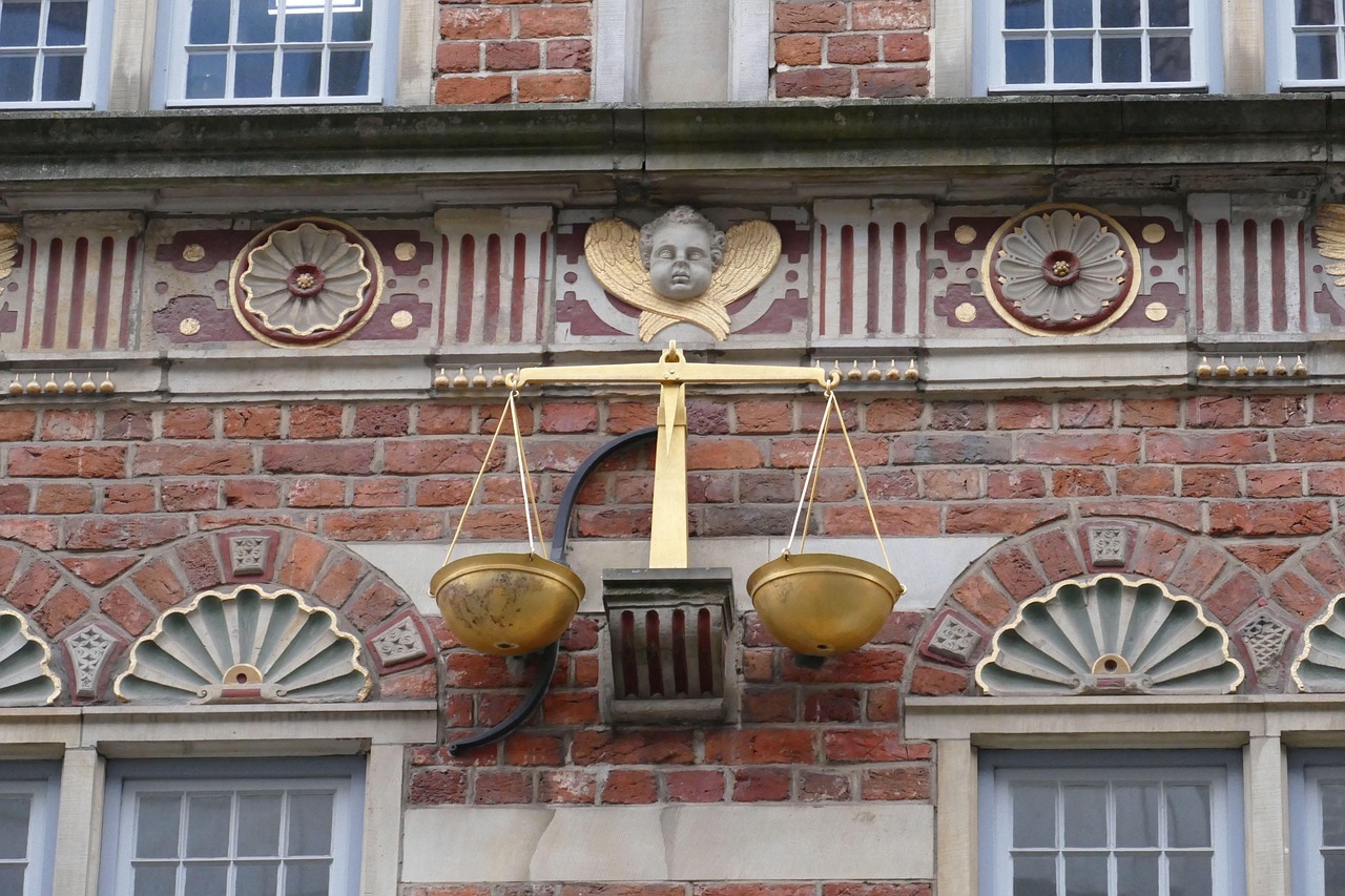Schalen-Waage als architektonisches Element an einer Hauswand in Bremen