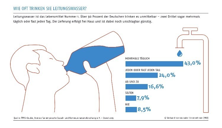 Auch die Marktforscher stützen mit ihren Ergebnissen die in den Straßen wahrnehmbare „Lust auf Wasser“. Fast 92 Prozent der Befragten geben an, Wasser aus dem Wasserhahn zu trinken. Mehr als zwei Drittel tun das ein- bis mehrmals täglich, über 83 Prozent trinken Leitungswasser zumindest ab und zu. Dabei bewerten sie die Qualität des Trinkwassers als „sehr gut“ bis „gut“ (84 Prozent). Über 90 Prozent schätzen es als „sauber und rein“ ein und geben an, es ohne Bedenken zu trinken. Auch die Wasserlieferanten, die Versorger von denen das Wasser aus zumeist lokalen Quellen stammt, werden gelobt. Knapp drei von vier Befragten geben für Service und Servicequalität der Wasserversorger die Noten „sehr gut“ oder „gut“. Über 86 Prozent sind mindestens zufrieden mit der Leistung ihres heimischen Wasserversorgers.