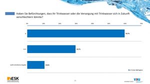 Medienthema gemacht. Vergleiche von Leitungswasser und Mineralwasser durch die Stiftung Warentest und Ökotest haben die Diskussion um das Thema „Trinkwasser“ auch in den sozialen Medien viral beflügelt. Aber trotz der vielen positiven Signale gibt es auch Nachdenkliches: Nitrat in Deutschland, Mikroplastik und Glyphosat. Zwischen dem Eintrag in die Umwelt und der Entnahme aus dem Wasserhahn stehen zwar noch leistungsstarke Kläranlagen und hochmoderne Wasserwerke. Über all das wacht eine Qualitätssicherung, die manch ein Lebensmittel aus den Regalen fegen würde. Aber dennoch, die Verbraucher sind verunsichert. Je stärker Wasser in den Medien präsent ist, desto häufiger findet man kritische Hinweise. Das findet seinen Niederschlag. Verbraucher machen sich Sorgen um Qualität und Versorgungssicherheit. Fast 60 Prozent der Befragten äußern diese Besorgnis. „Dennoch bleibt die Wertschätzung im Hinblick auf Qualität, Service, Preis sowie im Hinblick auf die Leistungen der Wasserversorger insgesamt auf einem hohen Niveau“, fasst der Bericht zusammen.