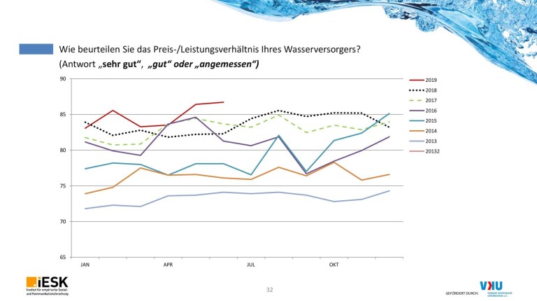 Vielleicht hilft ja der Klimawandel und eine wiederkehrende Dürre. Ein Blick auf die Befragungsergebnisse der vergangenen Jahre zeigt, dass nicht nur im Spätsommer die Stimmung besonders gut ist, sondern auch, dass die positive Beurteilung des Preis-/Leistungsverhältnisses schon im zu Sommerbeginn neue Höchstwerte erreicht hatte (siehe Abbildung unten). Also je knapper das Wasser, desto höher die Wertschätzung. Zudem wird gerade in den Hitzetagen deutlich, wie gut unsere Wasserversorgung funktioniert.