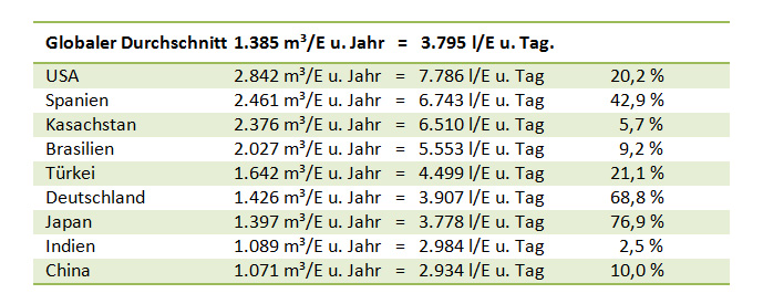 Bei den Entwicklungsländern ist eine größere Bandbreite zwischen 550 und 3.800 m³/Einw. und Jahr festzustellen. (Den niedrigsten Wert weist die DR Kongo mit 552, den höchsten die Mongolei mit 3.775 m³/Einw. und Jahr auf). Hier spielt nach Hoekstra et al. (2012) offensichtlich neben Unsicherheiten in der Datengrundlage und den unterschiedlichen Lebensstilen die niedrige Effizienz der Wassernutzung bei der Produktion von Gütern eine wesentliche Rolle. Dies gilt im Übrigen auch für einige Industrieländer.